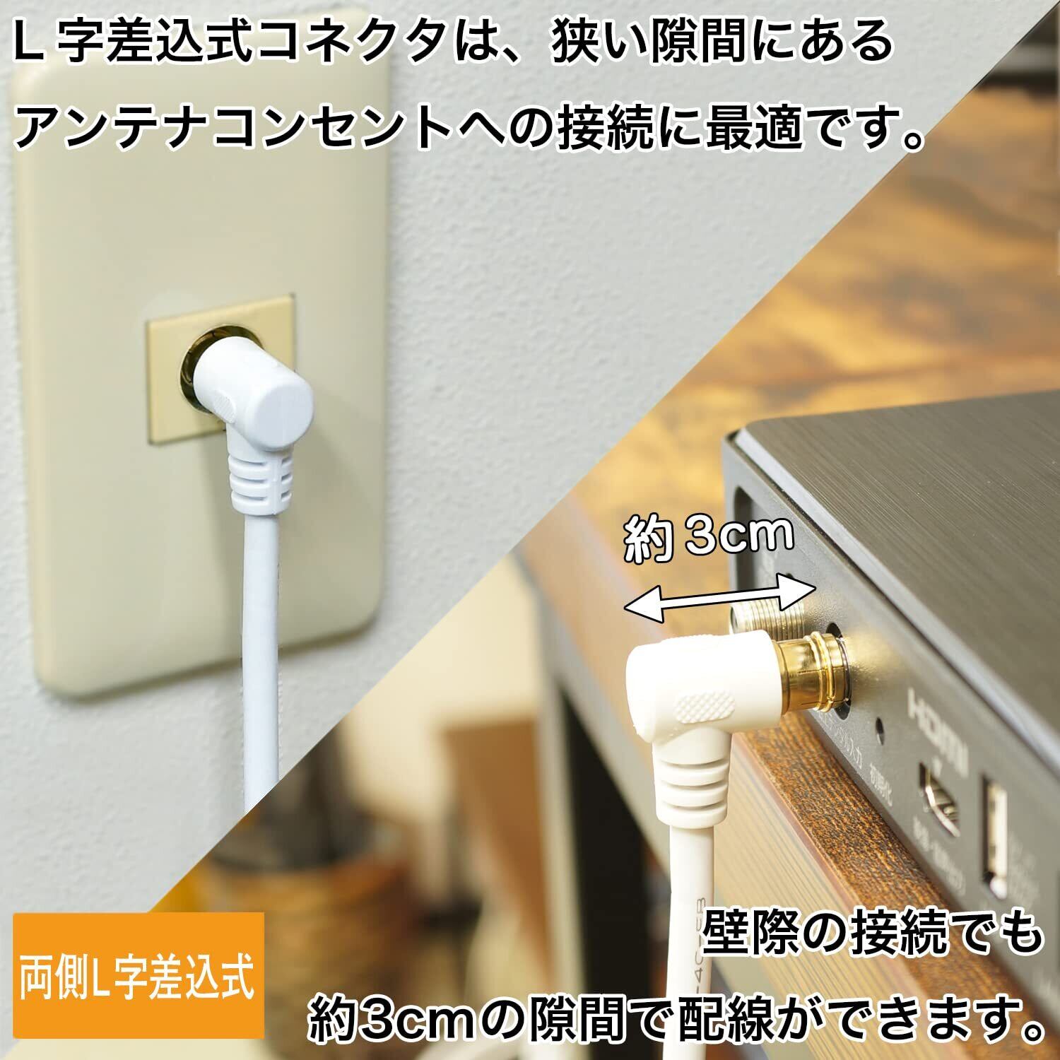 【配線しやすいL字差込式】L字差込式コネクタは、狭い隙間にあるアンテナコンセントへの接続に最適です。信号が劣化しにくい金メッキ仕様です。
