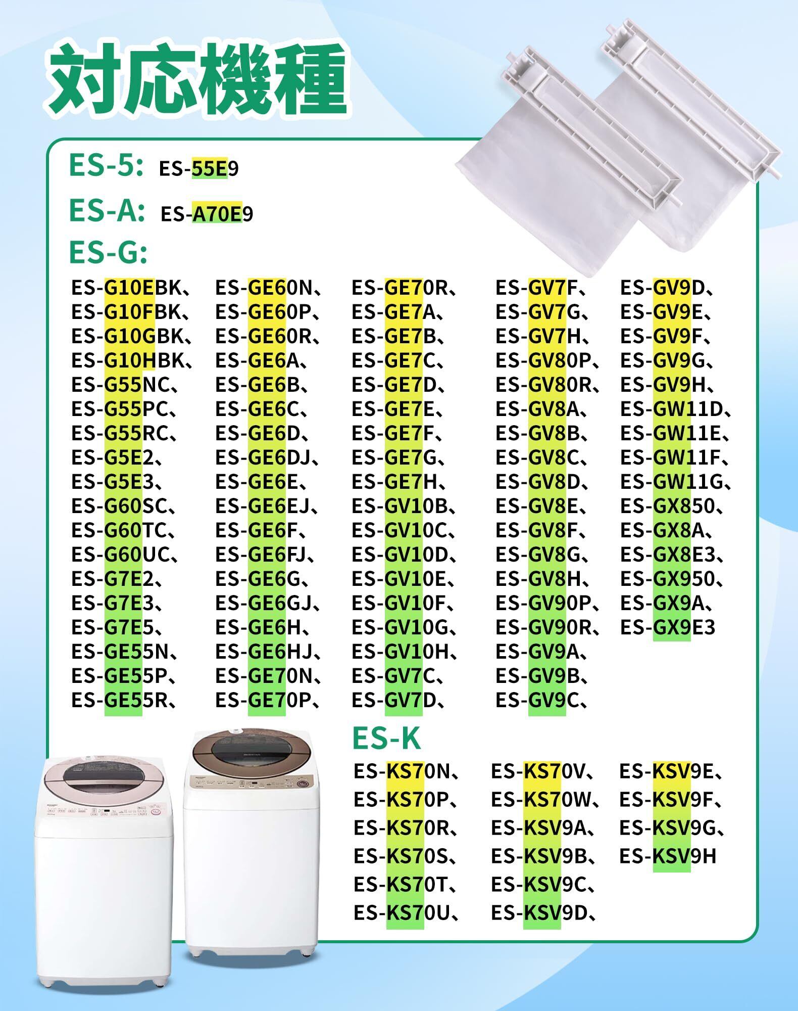 【多機種に対応可能】本製品はシャー プ対応用の洗濯機糸くずフィルターです。ES-GE70P-G、ES-GE70R-A、ES-GE7A-N、ES-GE7B-W、ES-GE7C-W、ES-GE7D-W、ES-G7E2-KB、ES-G7E3-KW、ES-G7E5-KW、ES-GE55N-S、ES-55E9-KB、ES-55E9-KP、ES-A70E9、ES-G10EBK、ES-G10FBK、ES-G10GBK、ES-GE60P-P、ES-GE60R-P、ES-GE6A-Pなどの機種に対応できます。具体的な商品説明をご覧ください。シャー プ洗濯機 糸くずフィルターの代用品です。購入前に洗濯機のブランドや品番を確認ください。