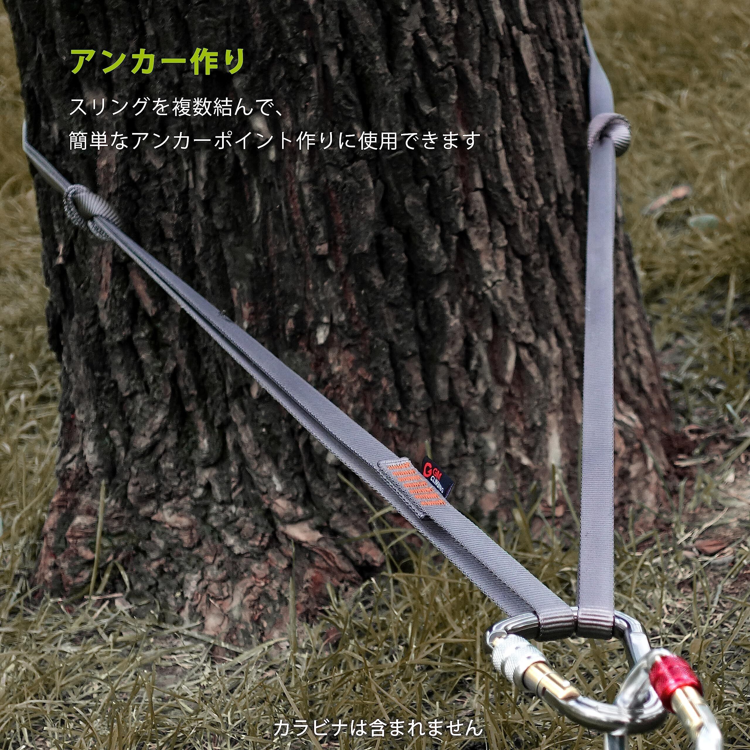 多用途で手軽に利用◆◆◆ナイロンスリングは非常に便利に使用でき、様々な場面で活躍され、アンカーポイント、トップロープ設置、簡易ハーネス作り、高所作業の安全確保使用、荷物を引っ掛けたり吊り下げたり、フットループ作り、バイクやカヤックなどの整備使用、ハンモック設営など、日常装備品やバックアップギアとして活用されます。