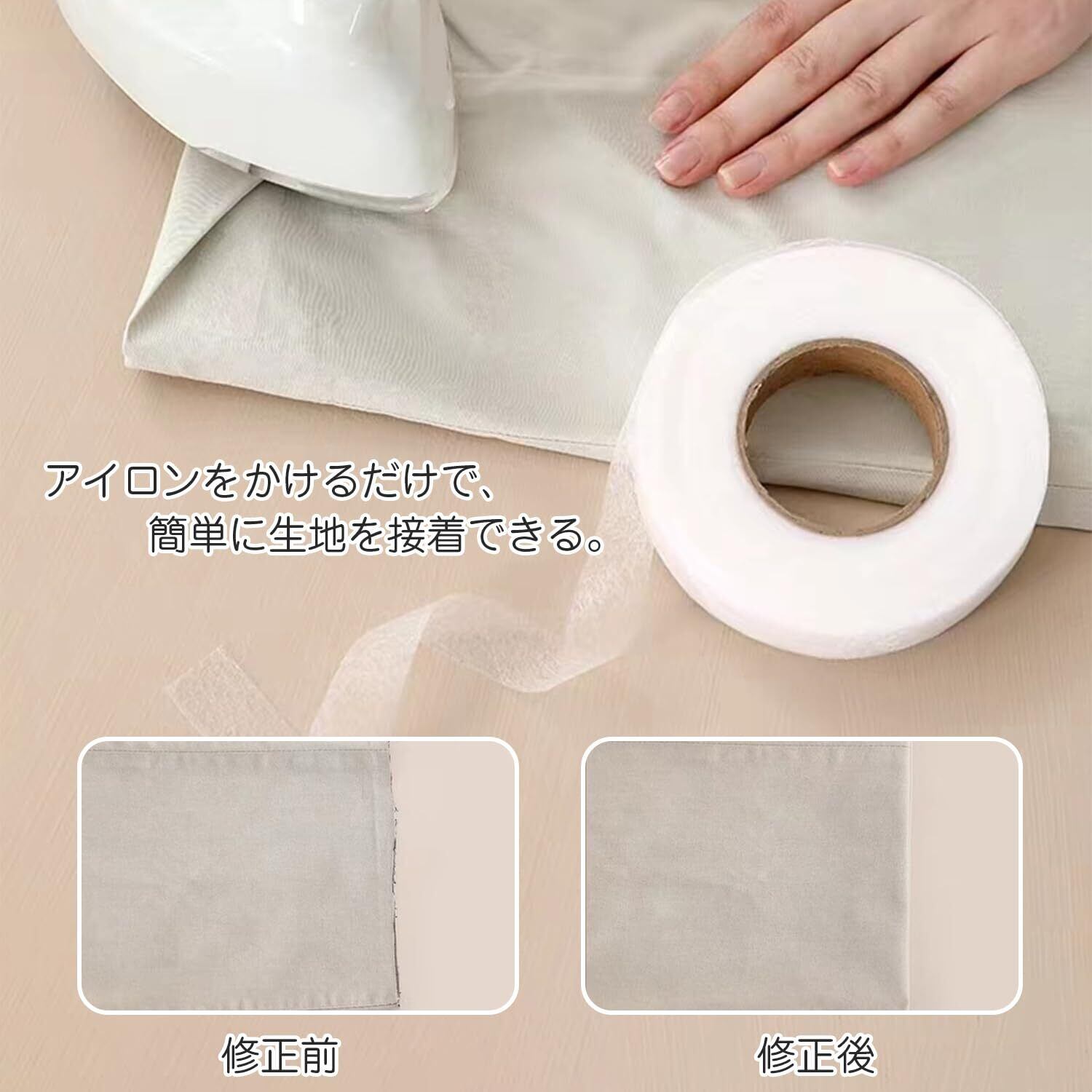 【製品の特徴】糸も針も不要、縫う手間もなくアイロンで簡単に端が折れます。裁縫が苦手な方、裁縫が面倒な方におすすめです。洗濯機で洗え、ドライクリーニングも可能。 貼り替えるときは、アイロンで温めてからゆっくりはがすと簡単にはがせる。アイロンテープの強度だけが必要な場合は、粘着テープを何重にも重ねて使用することもできます。