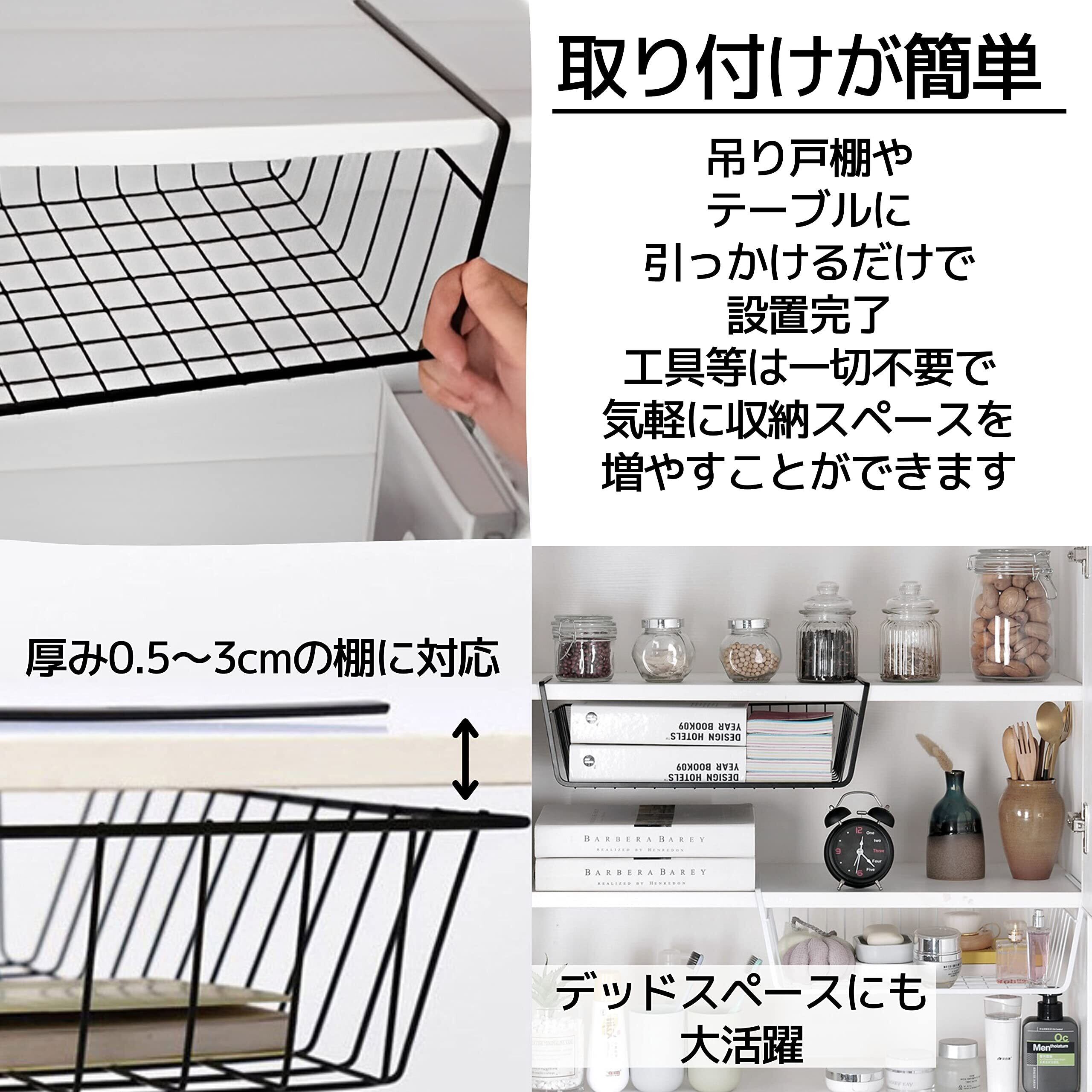 【取り付けが簡単】この収納カゴは、工具要らずのかんたん組立式吊り戸棚:吊り戸棚に引っかけるだけ、工具等は一切不要で簡単設置です。 厚み0.5~3cmの棚に適用します。