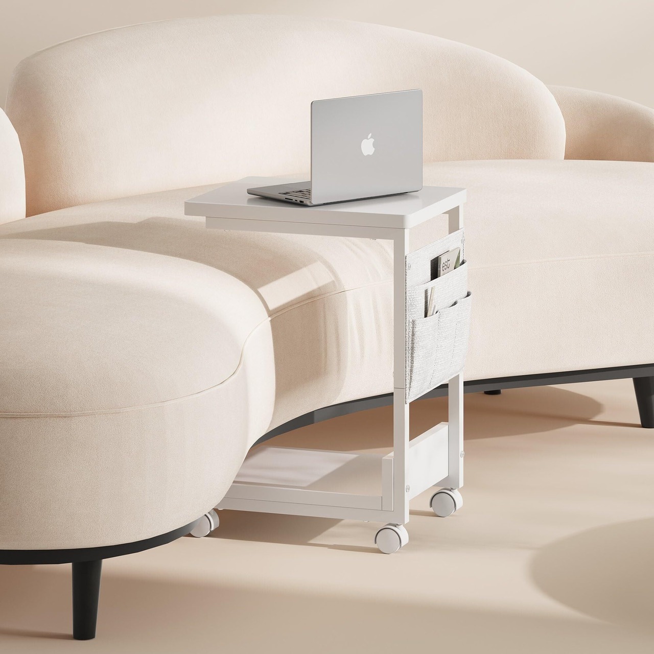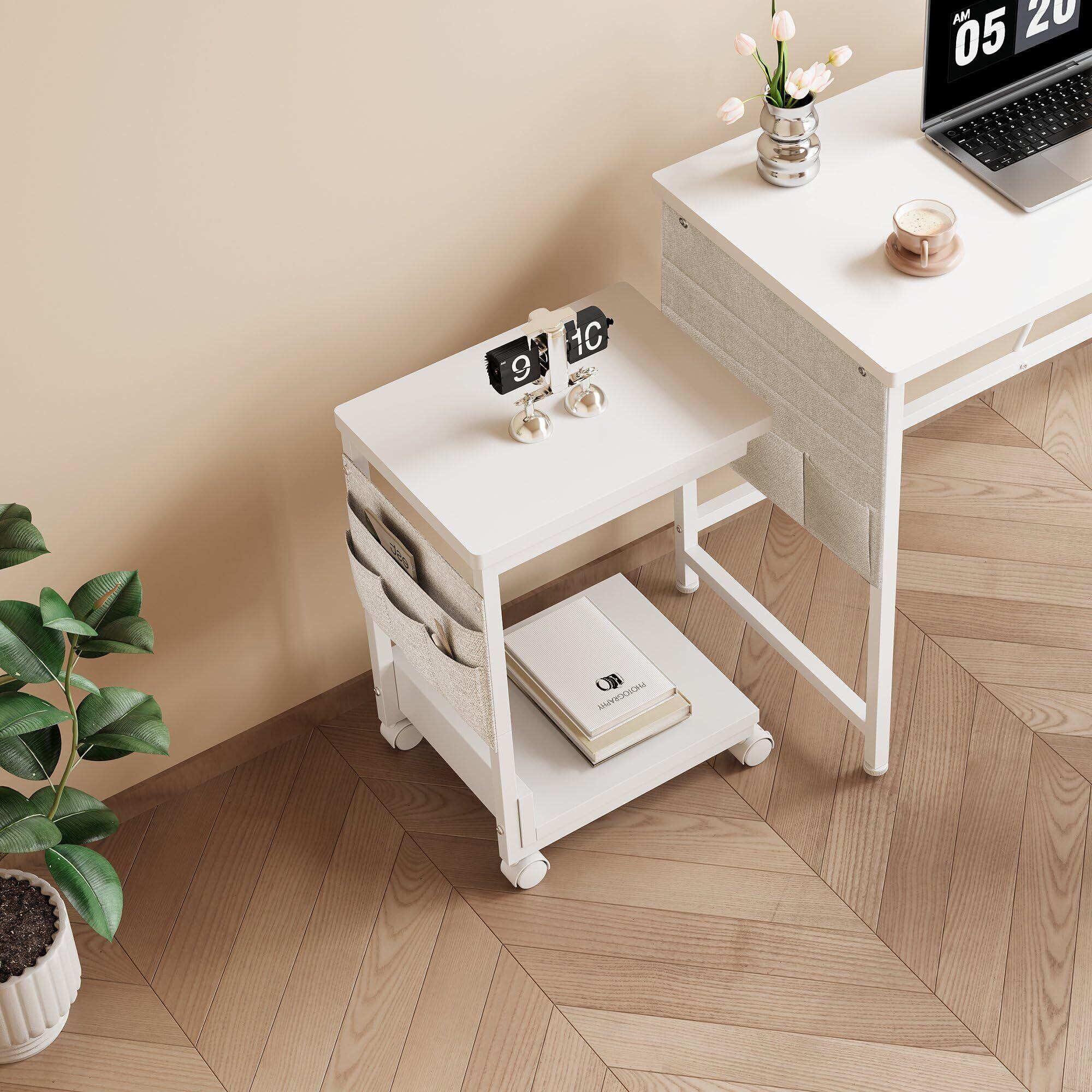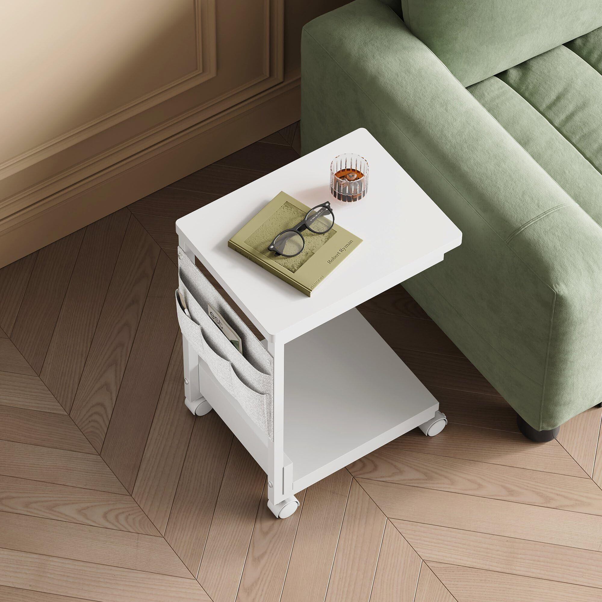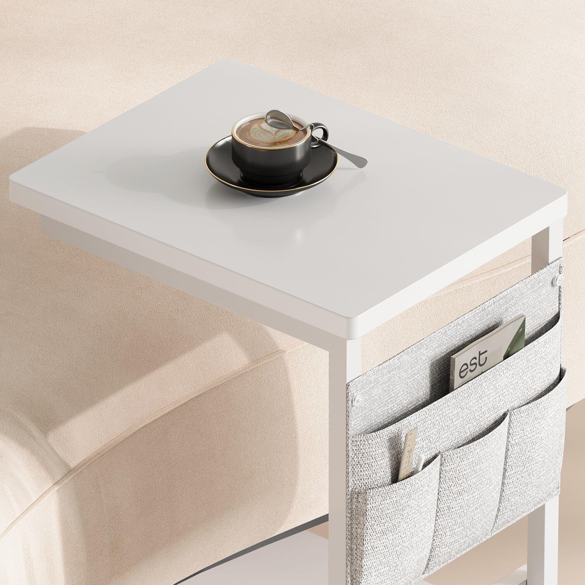YeTom サイドテーブル キャスター付き サイドテーブル ベッド横 スリム 収納袋付き ソファーテーブル bedside table サイドデスク 幅36.5×奥行26×高さ47.8cm(キャスター約5CM) ホワイト
