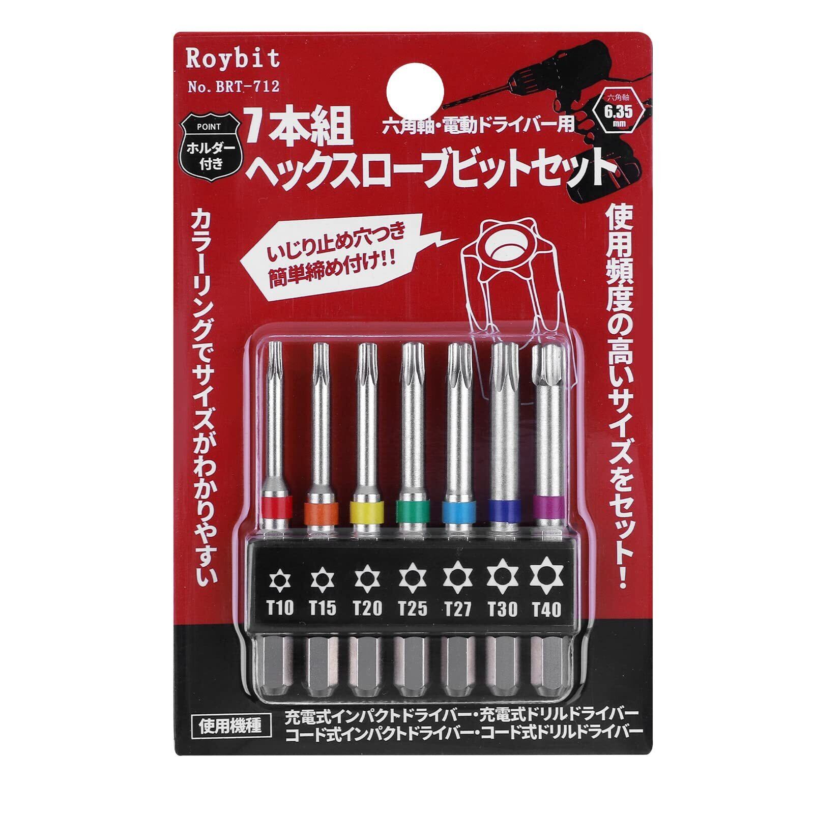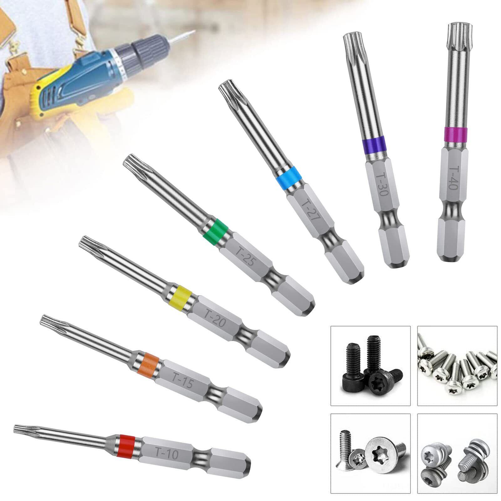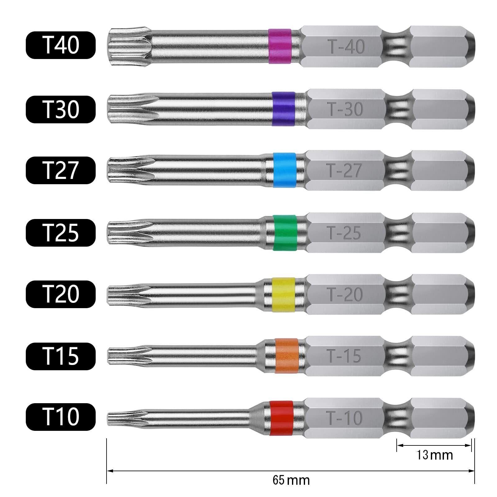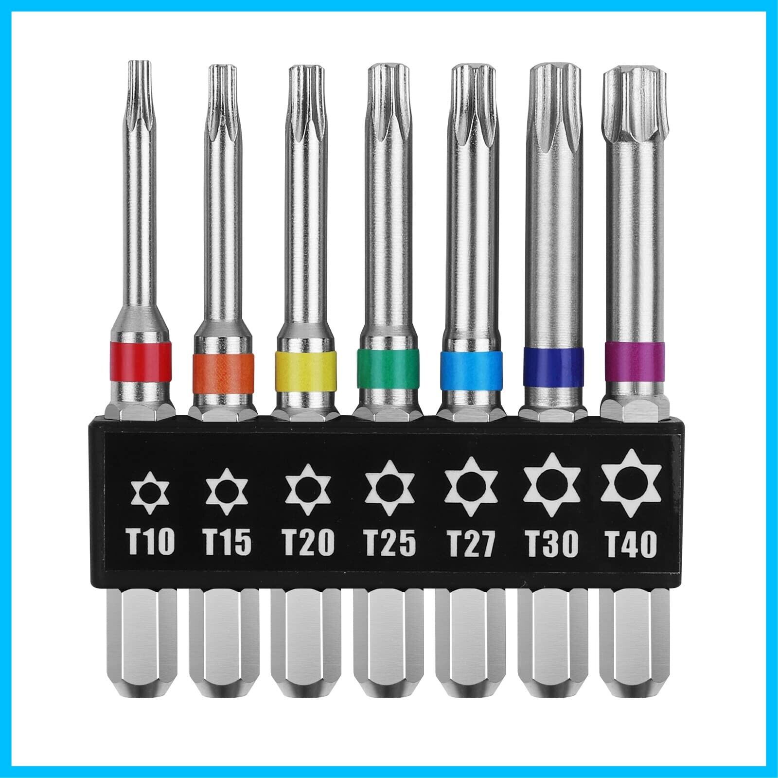 【商品仕様】サイズ:T10、T15、T20、T25、T27、T30、T40(各サイズ1本ずつ)。セット内容:7本組。シャンク径:6.35mm。素材:クロムバナジウム鋼。硬度:HCR60±。