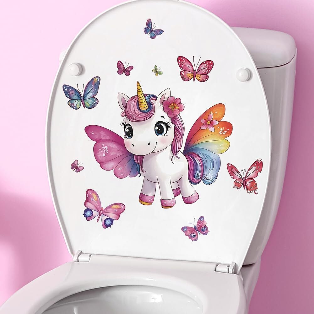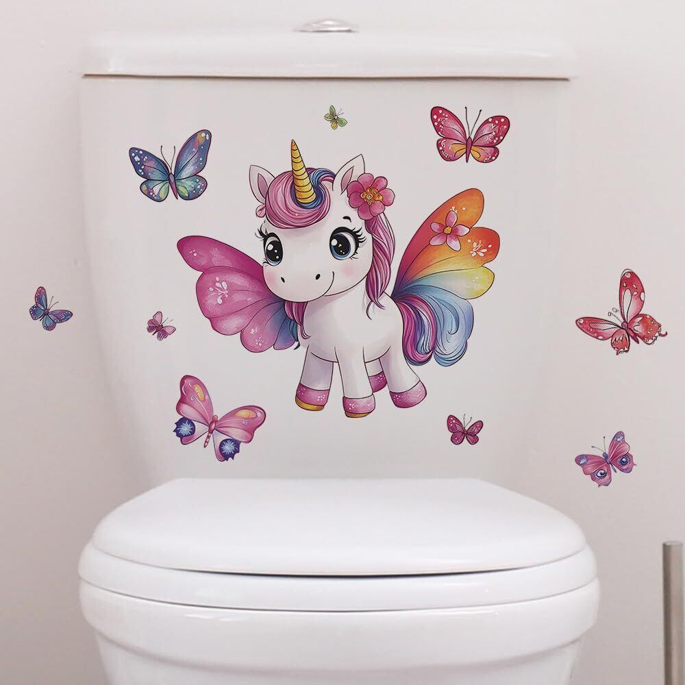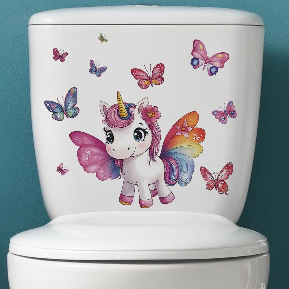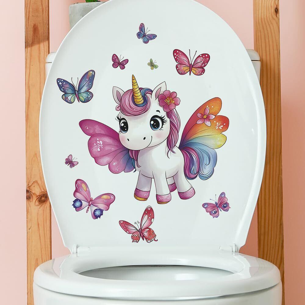 便器 シール ウォールステッカー 動物 可愛いユニコーン&バタフライ トイレステッカー,トイレ ステッカー おしゃれ,トイレタンク 飾り,かわいい動物 一角獣便器 ステッカー ,toilet sticker 便器に貼るシール 29×29cm, 防水デコレーションシール