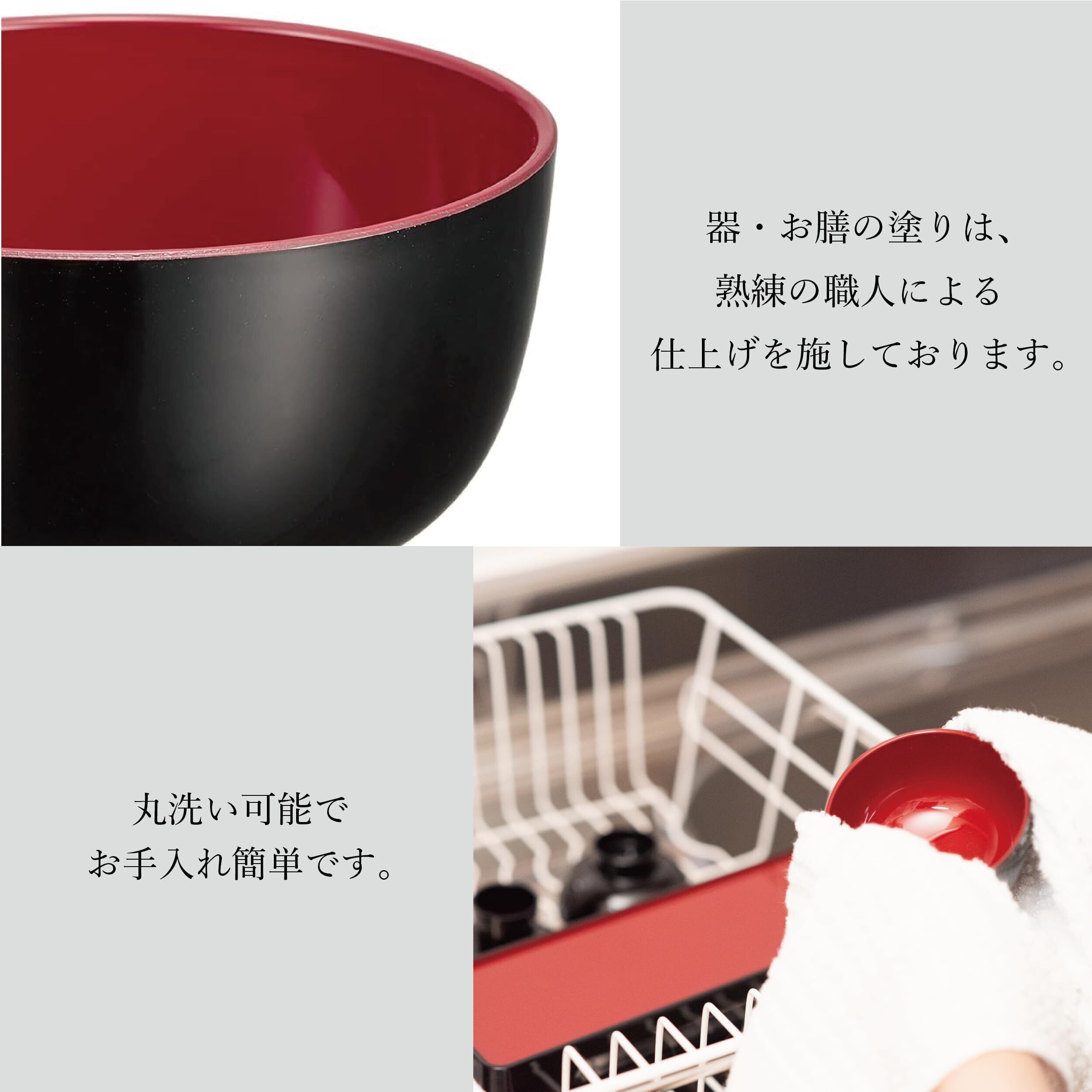 茶碗や供物台などすべて樹脂製のため、水洗いで手軽にお手入れができます。軽量で片付けも簡単。化粧箱にお椀、お皿の並べ方を記載してあり、初めて仏器膳を使う方でも迷わずお供えすることができます。