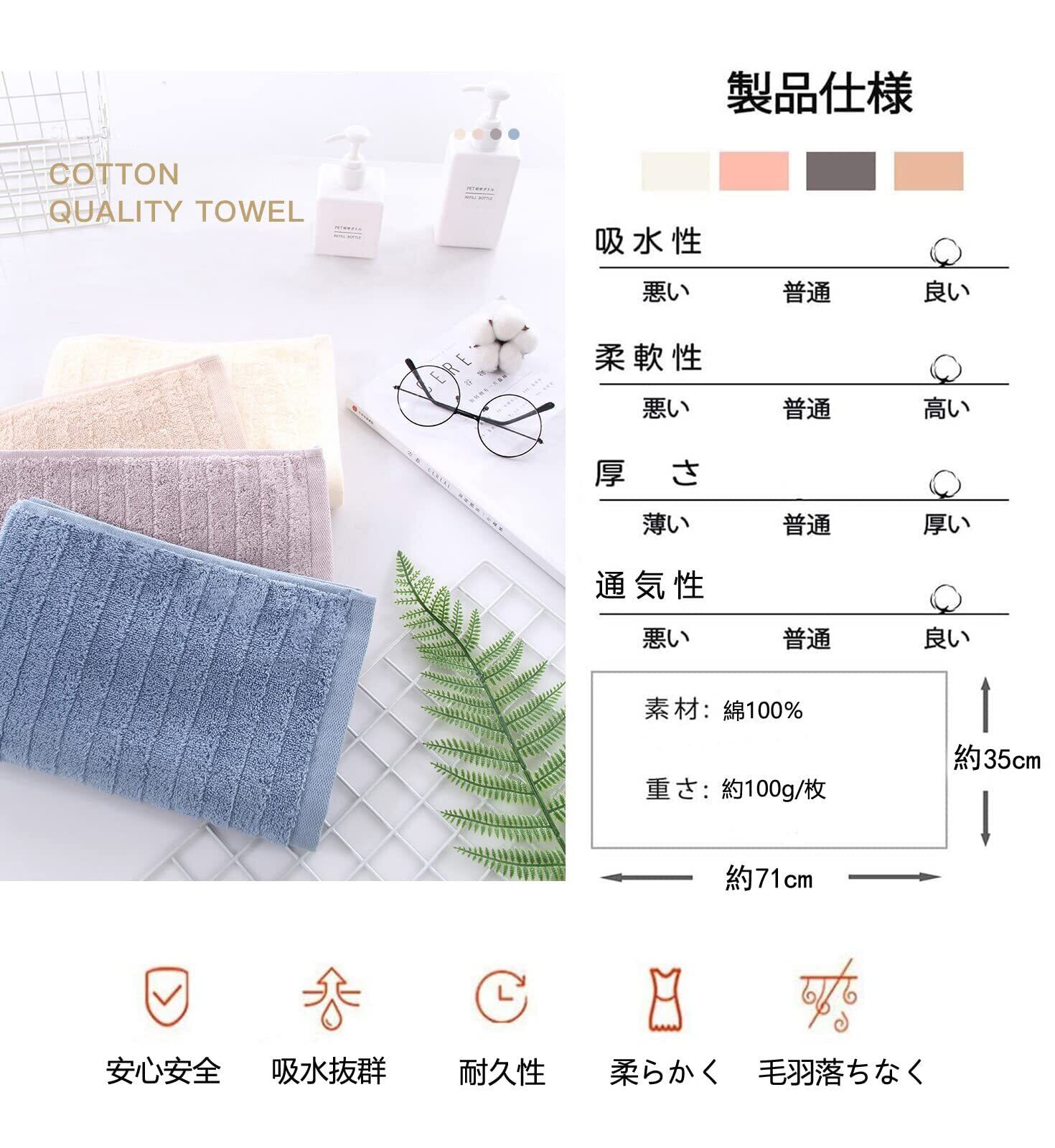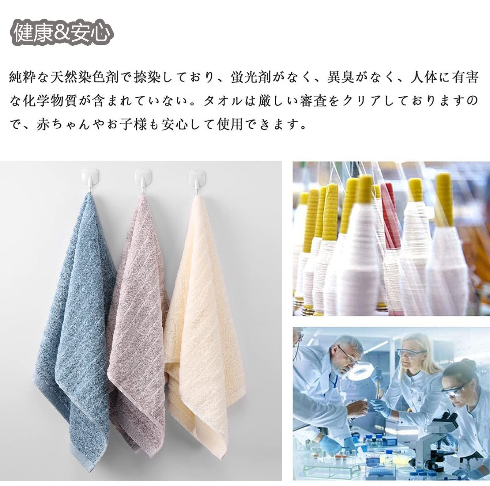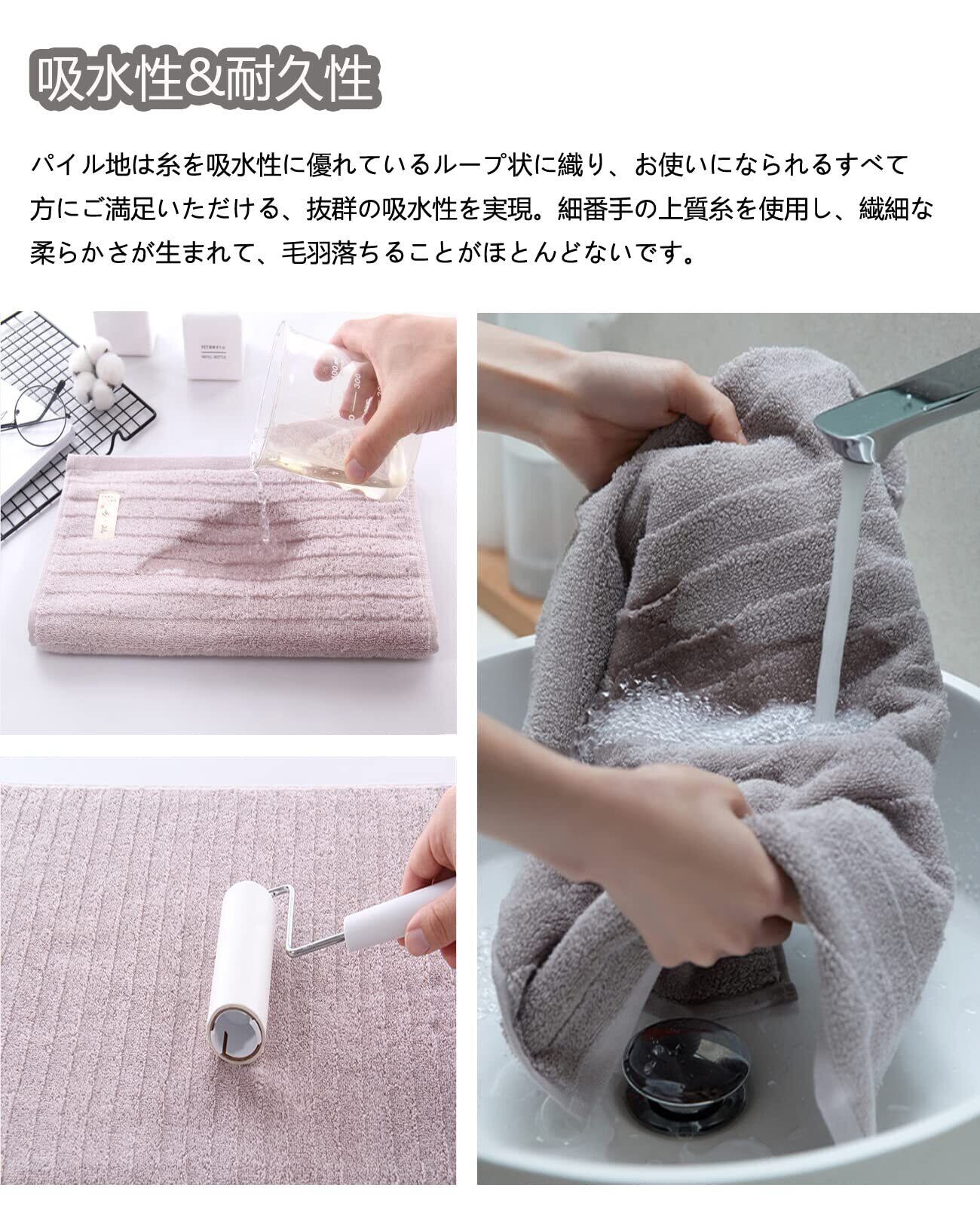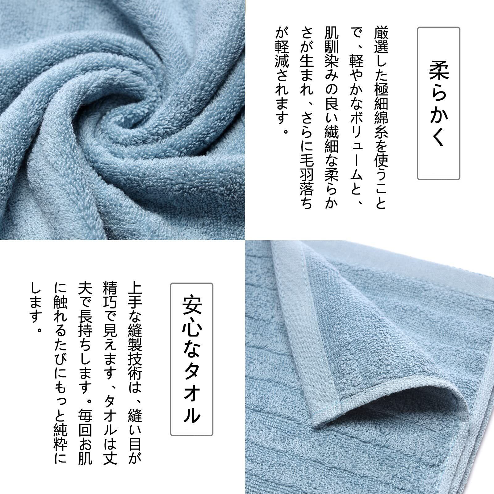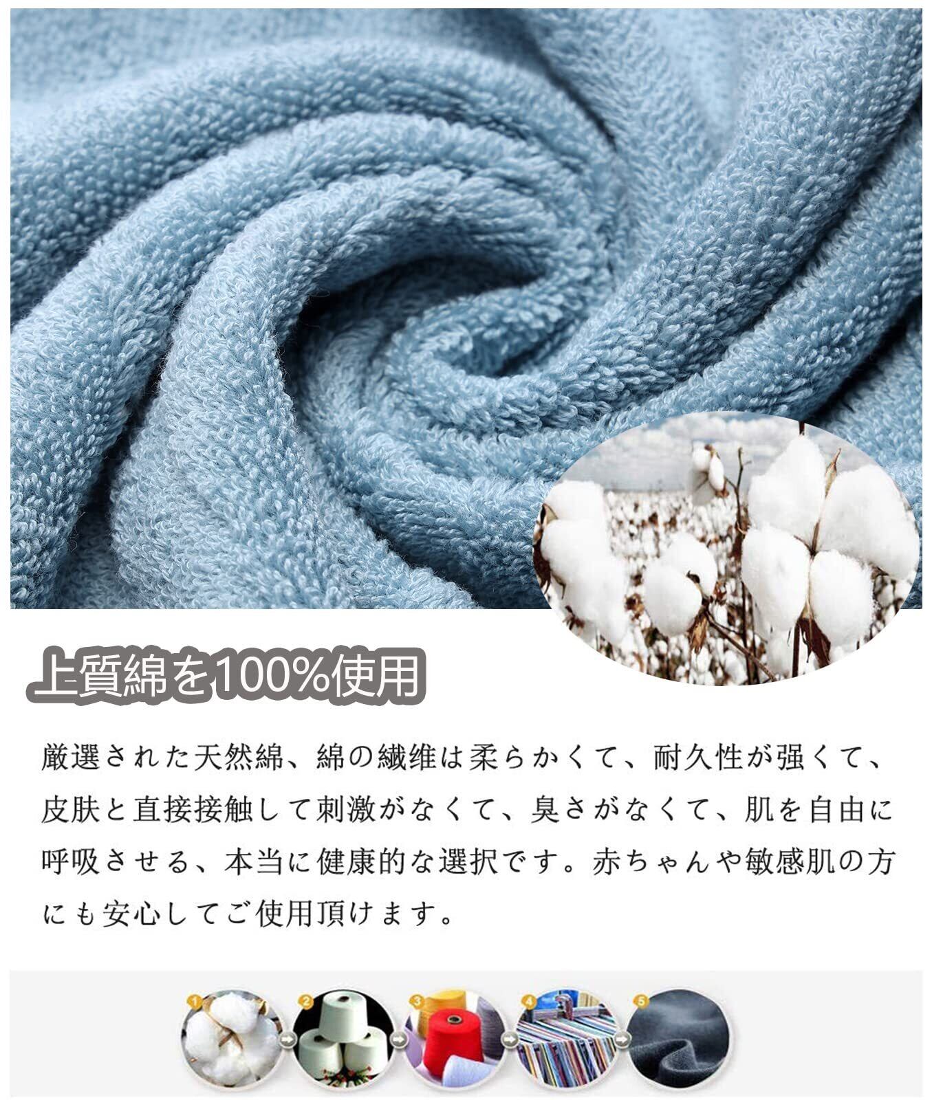 【優れた品質】厳選された100%綿の素材、蛍光染料は使用しておりません、優しく柔らかい肌触り、優れた通気性。安全で快適な使い心地が備わっているので、赤ちゃんや敏感肌の方にも安心してご使用頂けます。高密度で織ったことで、洗濯しても変形しにくく、長持ちできる、色移りの心配もありません。普通のタオルよりも長く使います。