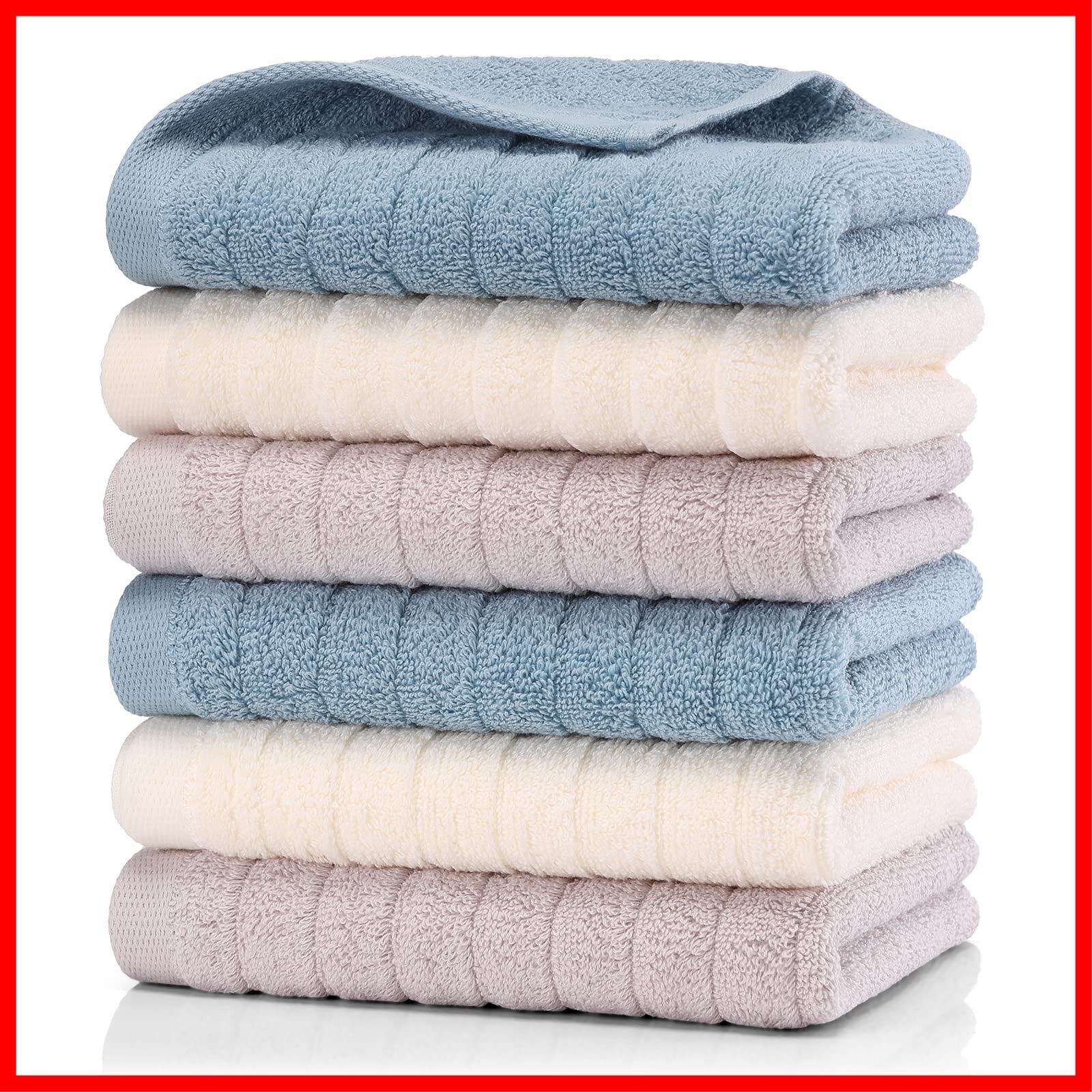 【フェイスタオル 6枚セット】素材:綿100% 、サイズ:約35x71cm 、重量:1枚あたり 約100g 、セット内容:ラベンダー2枚+ベージュ2枚+ブルー2枚