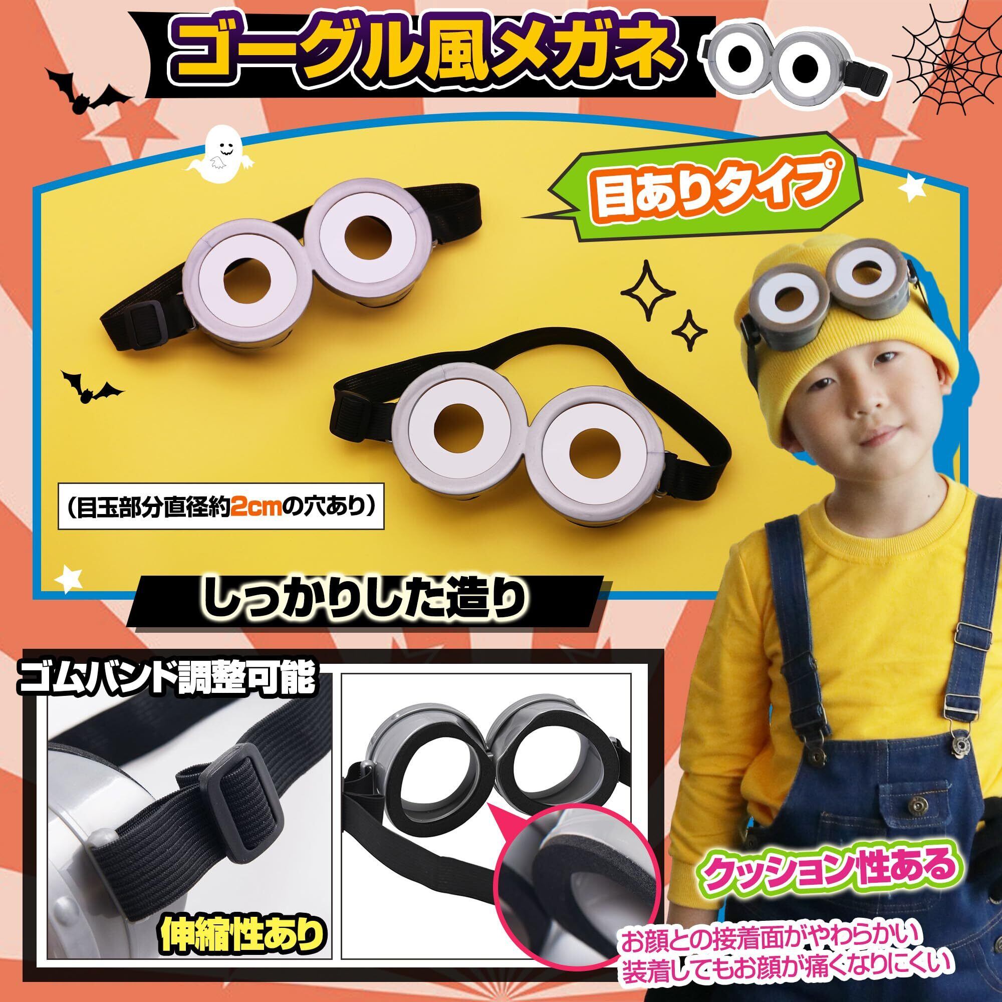 【2種のゴーグル風メガネ】目なしタイプ/目ありタイプ(目玉部分直径約2cmの穴あり)の2種! ゴーグルはしっかりした造りです。お顔との接着面がやわらかいウレタン風素材(クッション性ある)が付いておりますので、装着してもお顔が痛くなりにくいです。 約6.8×15×4.3cm、後ろゴムバンド調整(伸縮性あり/調節機能付き)可能。黄色いニット帽の上からゴーグル風メガネを乗せていただいてもオシャレです。・素材:プラスチック ・サイズ:フリーサイズ(キッズ)