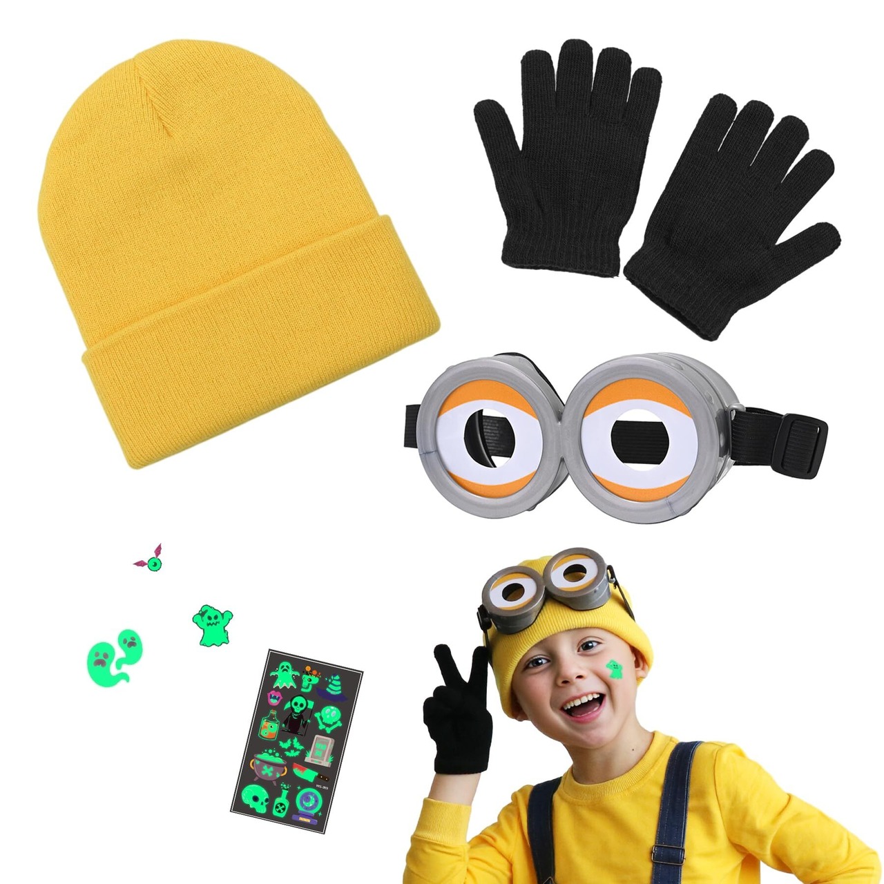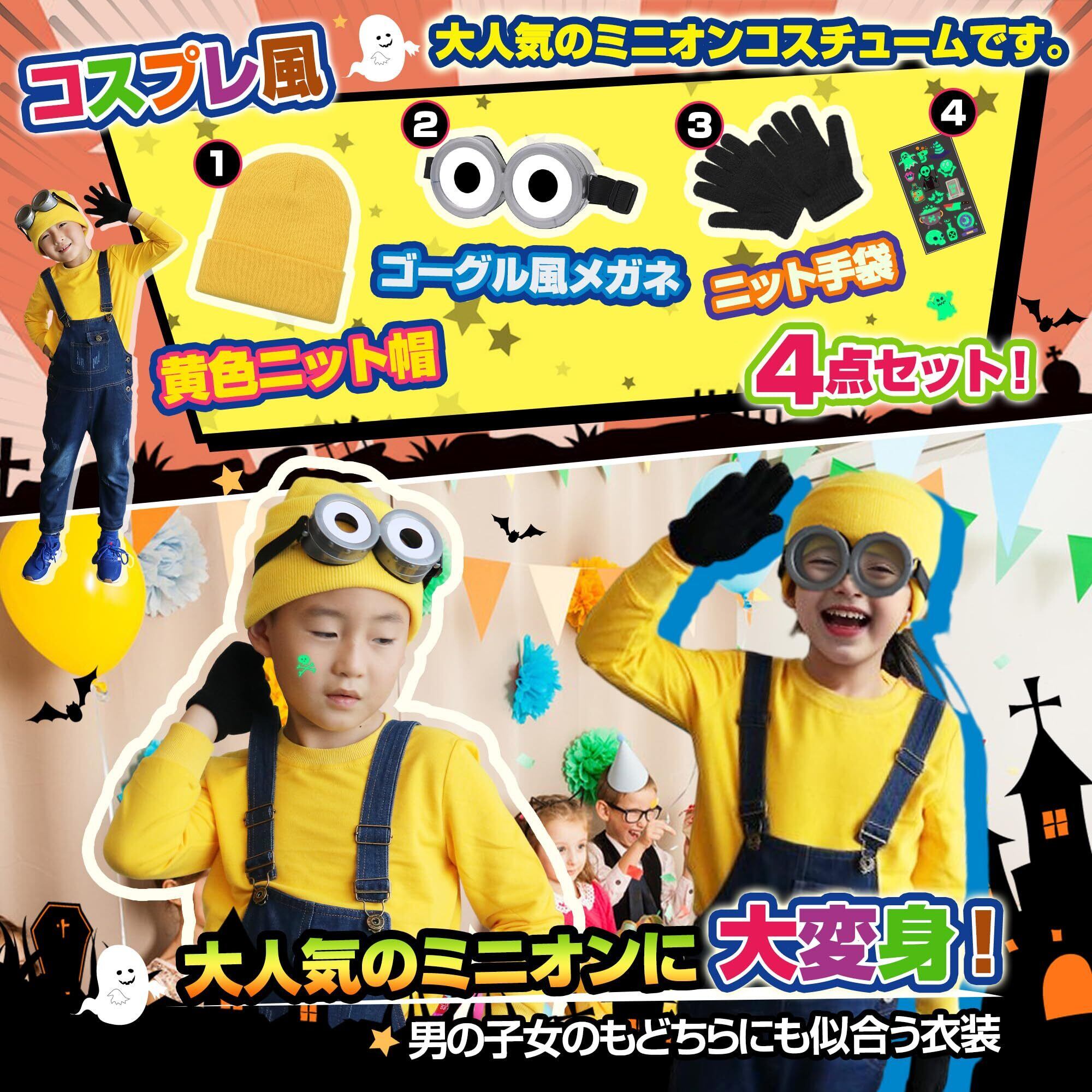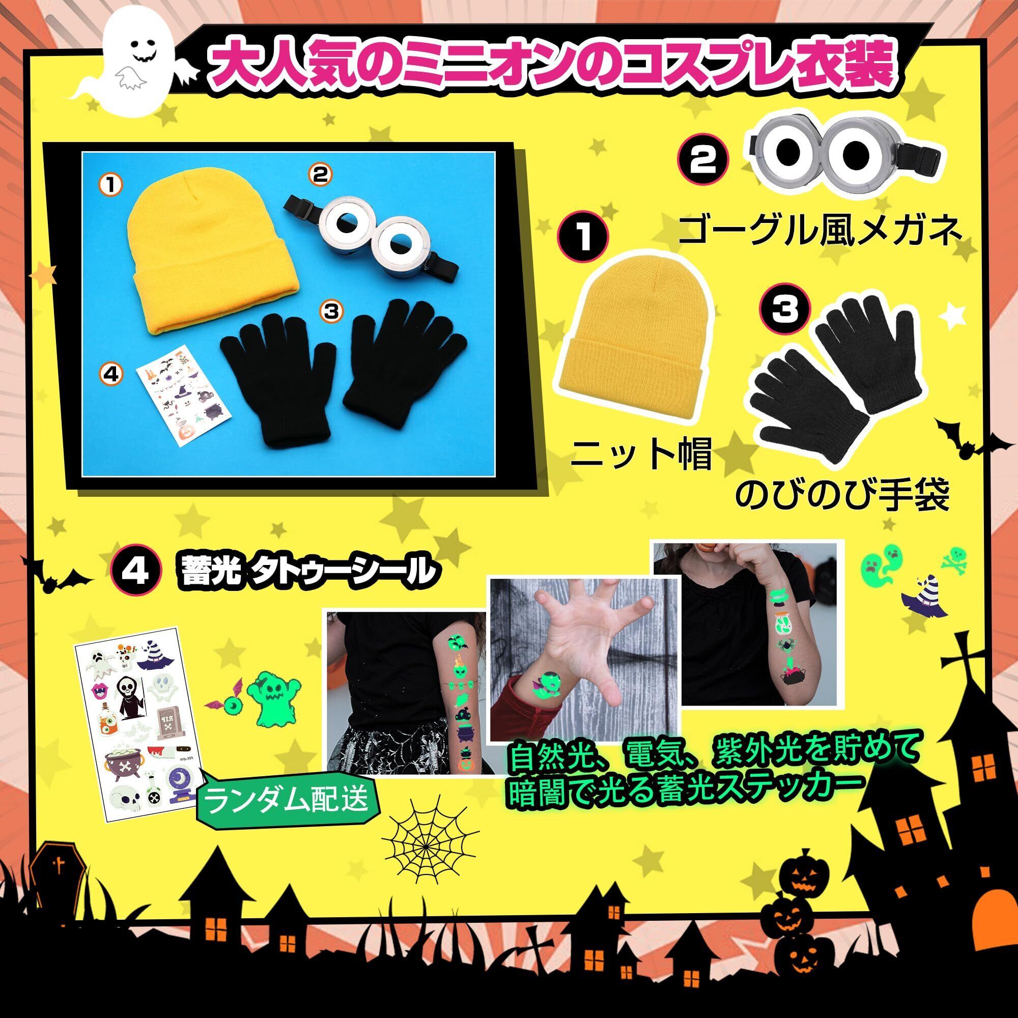 【大人気のコスプレ衣装】コスプレ風:ニット帽・ゴーグル風メガネ・のびのび手袋の3点セット!普段着はもちろんのこと、ハロウィン、イベント、パーティー、クリスマスなどでフル活用いただけるセットアップ商品です。ギフト・プレゼントにも喜ばれます。男の子も女の子も着て頂けます! ギフト:1枚のハロウィン専用蓄光タトゥーシールをワンセットでお届け致します。自然光、電気、紫外光を貯めて暗闇で光る蓄光ステッカーは、お祭りやテーマパーク、ナイトイベントなど暗がりでのイベントと好相性!