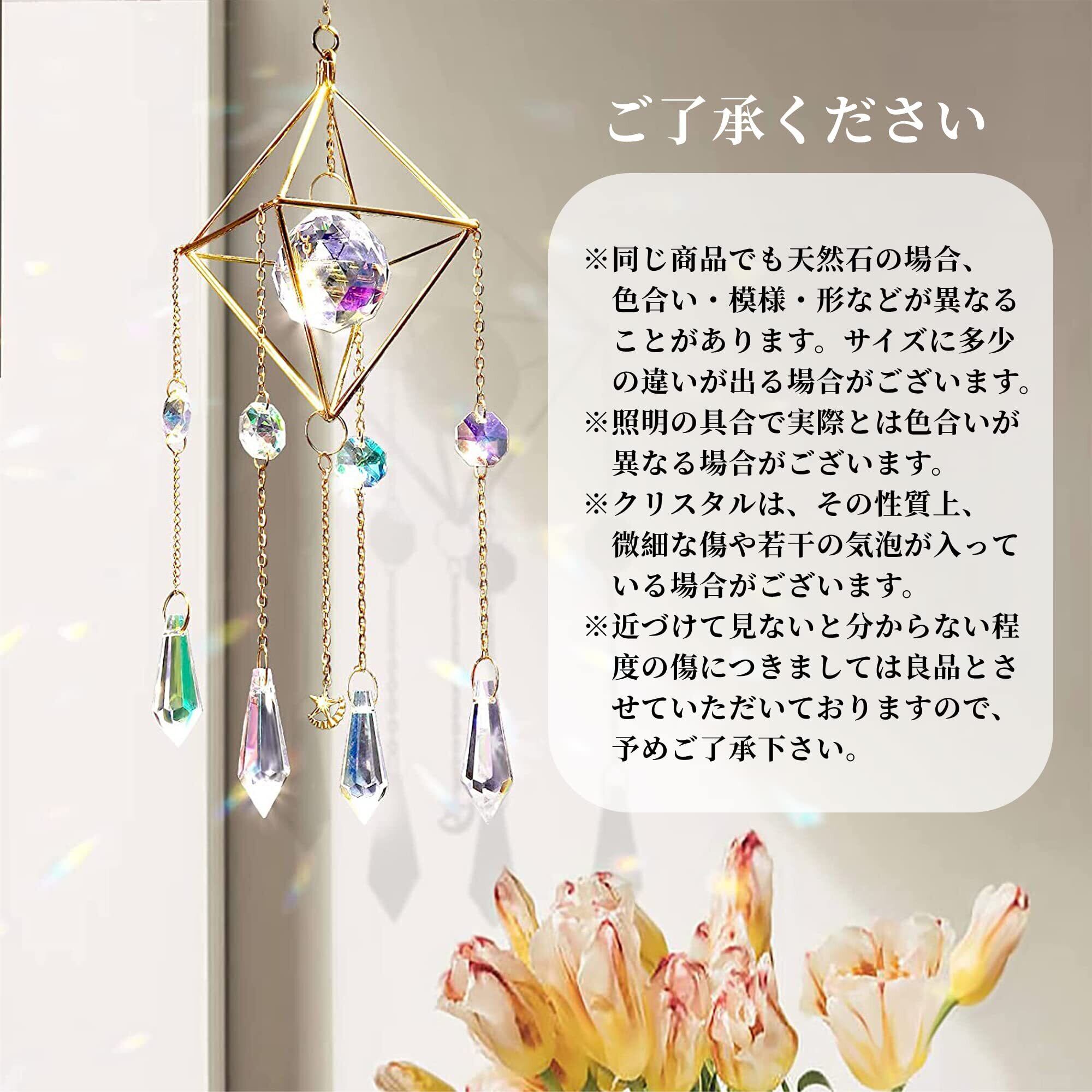 サンキャッチャーとは:北欧で生まれたと 言われるインテリア用品です。 日照時間の短い北欧の地で、 長く日の光を 楽しむためにできたと 伝えられております。 太陽光が当たると七色の虹を映し出し、 近年では人気があります。