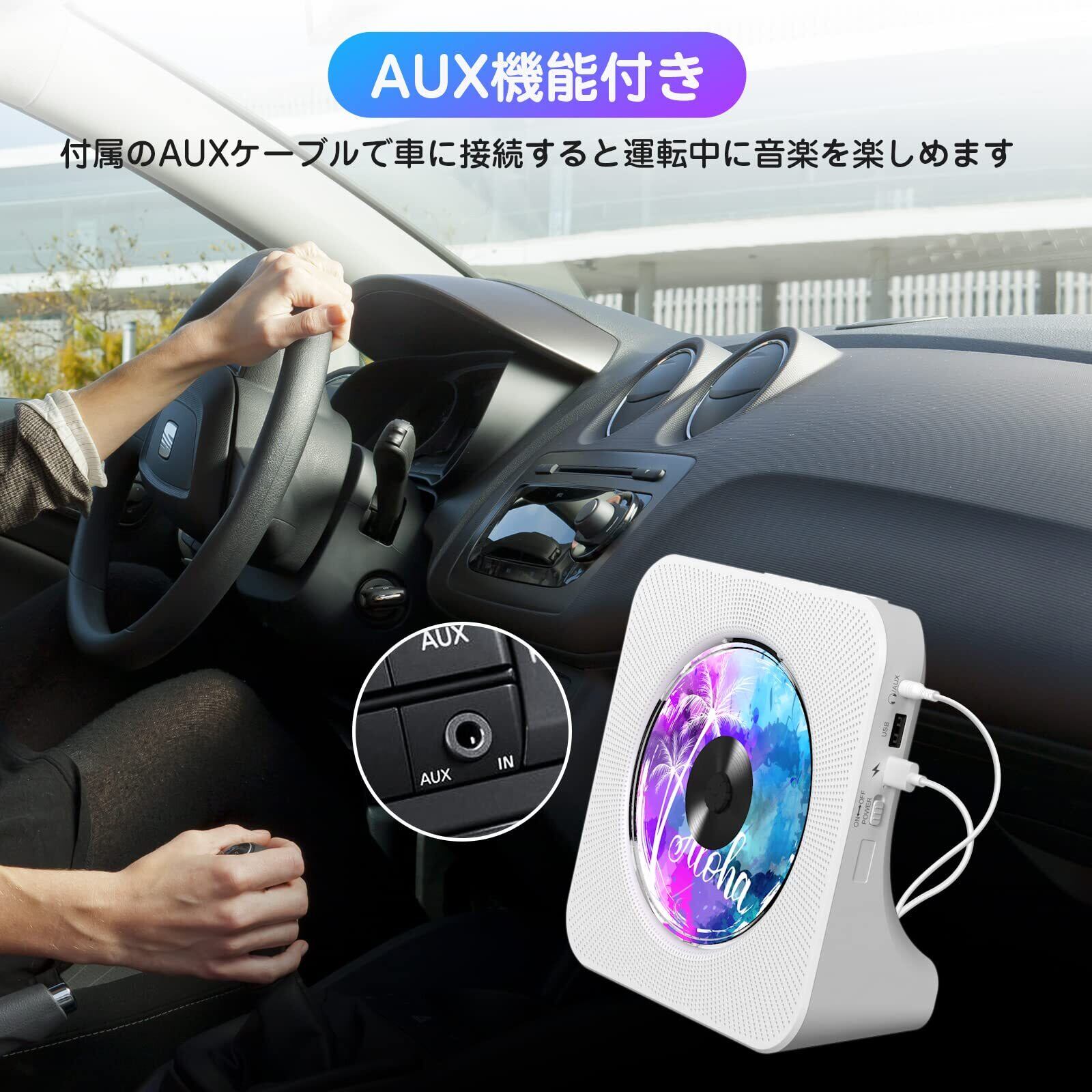 「2023年革新版の多機能CDプレーヤー」本卓上置き式CDプレーヤーはBluetoothを搭載しており、スマホなど他のbluetoothデバイスの音楽が再生できます。CD放送のほかに、本製品はAUX機能も搭載しており、付属のAUXケーブルでCDラジオと車など外部のオーディオデバイスに接続して音楽が再生できます。モバイルバッテリで給電可能とFMラジオ機能(周波数:76KHz-90MHz)付きで、緊急時に実用的な防災ラジオとしても使えます。また、本体またはリモコンの“MODE”でBluetoothモード/CDモード/FMモード/USBモード/AUXモードなど5つのモードを手軽に選択できます。ご注意!ご注意!ご注意!1、本製品は、対応するUSBメモリーカードをCDモードで挿入すると、自動的にUSBメモリーカードを読み込み、音楽を再生することができます。2、本製品はFAT16/FAT32のUSBメモリーカードに対応します。NTFSに対応しません。ご了承ください。