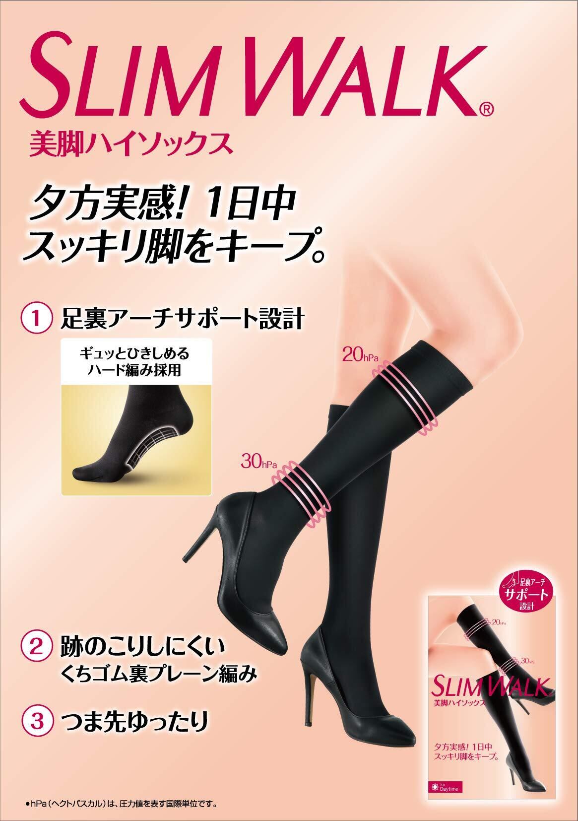 【スリムウォークとは】スリムウォークは、はくだけで 美脚 や 足 をスッキリしてくれる 着圧 レッグウェア です。風合いや素材にまでこだわった日本基準の高品質・高機能で、最高の はきごこち と 機能 を追求。
