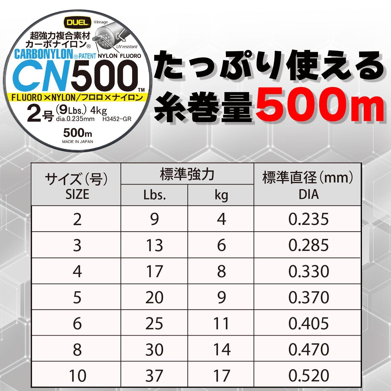 【CARBONYLON PATENT】:感度・耐久性・使用感に優れたCN(カーボナイロン)の特徴はそのままに、ルアー釣りから波止釣りまで様々なフィールドで使えるオールラウンドタイプとして設計。<br>全てのアングラーにおススメのラインです。