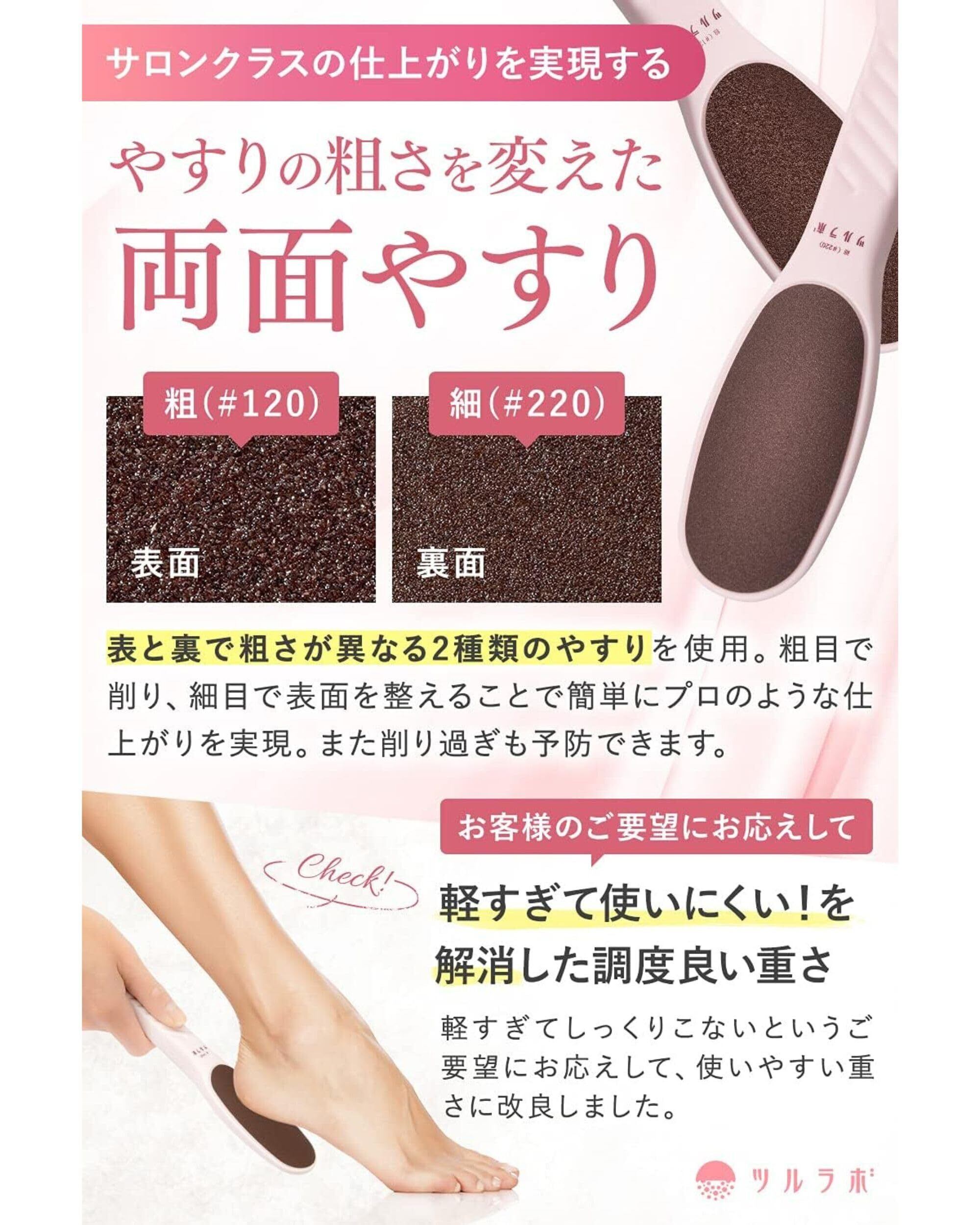 ️【使い易い形状と重み】握り易い形状を追及しました。【軽すぎて持ちにくかった従来品を改良!】重量感をもたせたことで手にしっくり馴染みます/力を入れずに楽々角質を除去/【粗面は力が入り易く踵の広範囲が削れるフラット設計・細面は細かなところや丸みがある部分にも柔らかく磨けるカーブ設計。】