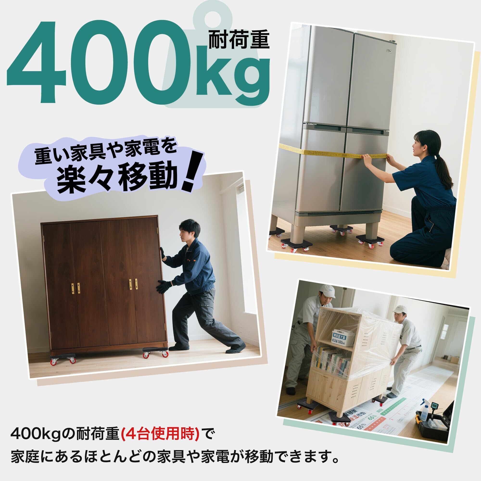 ● 台車最大使用荷重:400kg(※4個使用時) 家庭にある重たい重量物を楽に持ち上げて、簡単に移動することが出来る便利な道具。(容量200L冷蔵庫が約50KG)