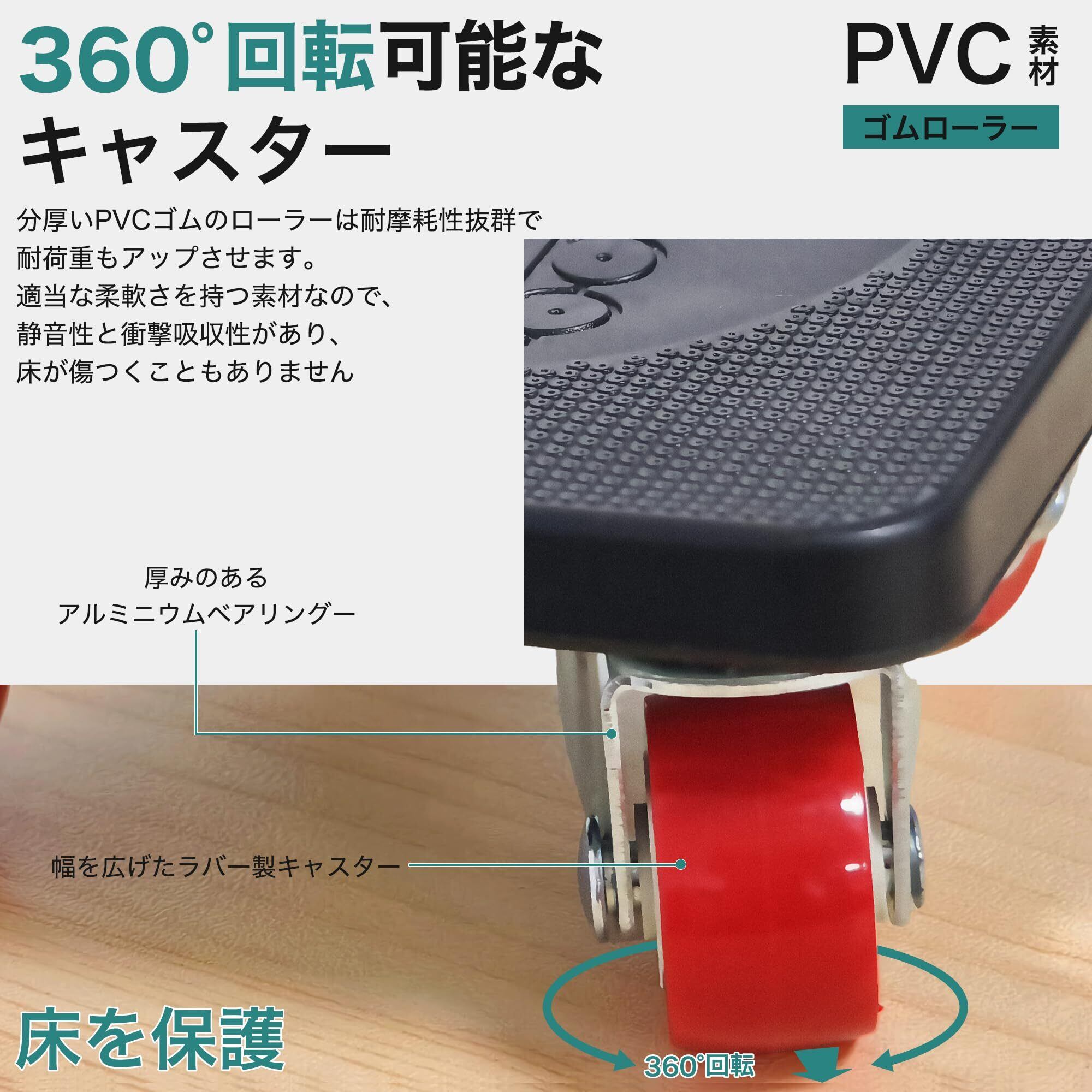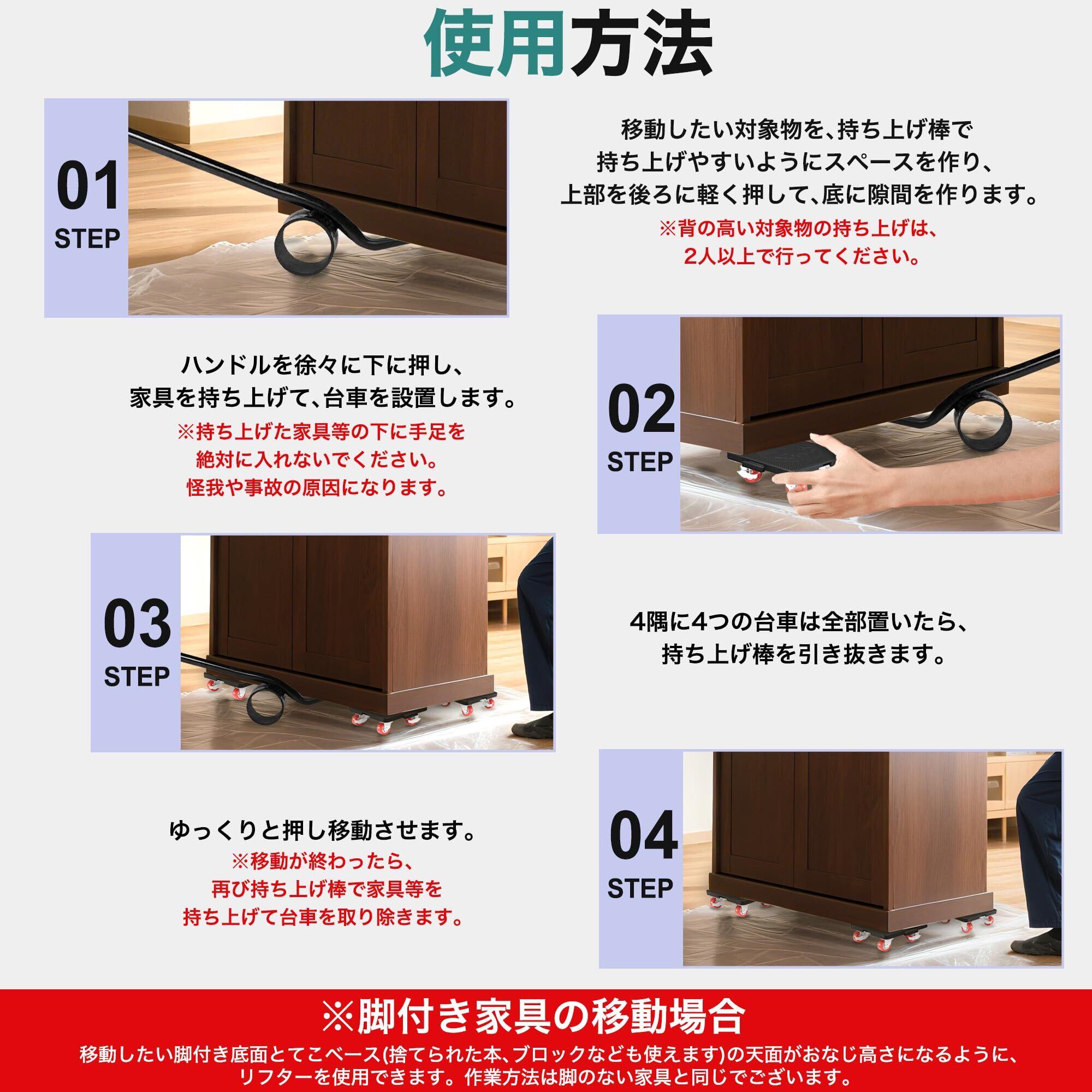 ● 持ち上げ棒:少しの隙間にもしっかり入れる薄さです。粘着性の滑り止めマット×2枚が付属して滑らないうえ床に傷をつかない。台車が360度回転可能でソファ、本棚、テーブル、椅子、ベッド、ピアノ、洗濯機/乾燥機、冷蔵庫などに最適です。