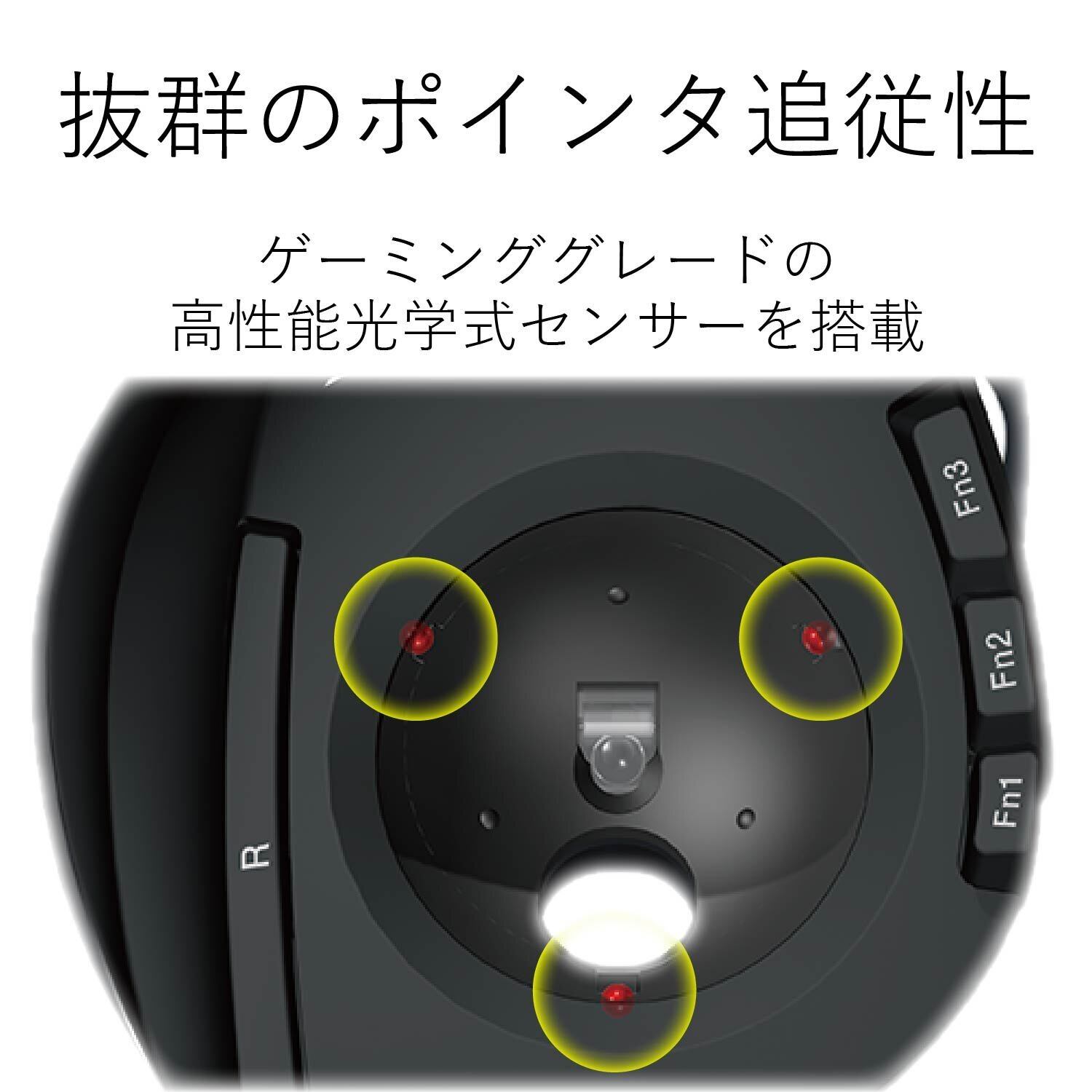 トラックボールの動きを検出するセンサーに、ゲーミンググレードの高性能光学式センサーを搭載し、新型の高性能レンズと周辺の光学設計の最適化で抜群のポインタ追従性を実現しています。