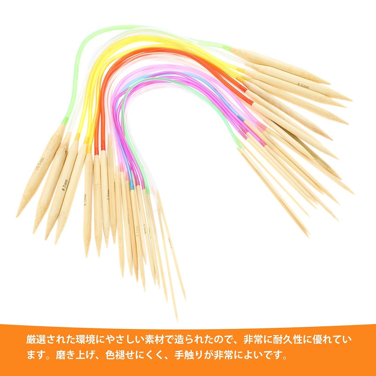 【サイズ】針の各サイズ:2.0mm 、2.25mm、2.5mm、2.75mm、3.0mm 、3.25mm、3.5mm、3.75mm、4.0mm、4.5mm、5.0mm、5.5mm、 6.0mm 、6.5mm 、7mm 、8mm、9mm、10mm 製品の全長:40cm 竹製の針の長さ:約10㎝