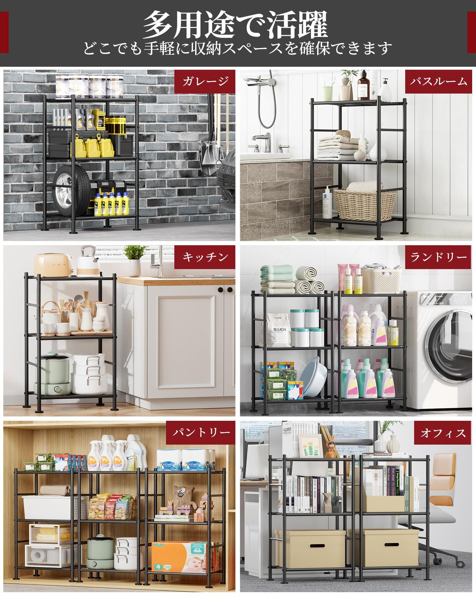 多用途な収納ソリューション:収納ラック は、パントリーやキッチンからガレージ、ランドリールーム、バルコニー、オフィスまで、さまざまな場所に適応可能。日用品や工具から植物や書籍まで幅広く収納でき、スペースを最大限に活用できます。さらに、スタイリッシュでモダンなデザインが、どんな空間にも機能性とおしゃれな雰囲気をプラスします。