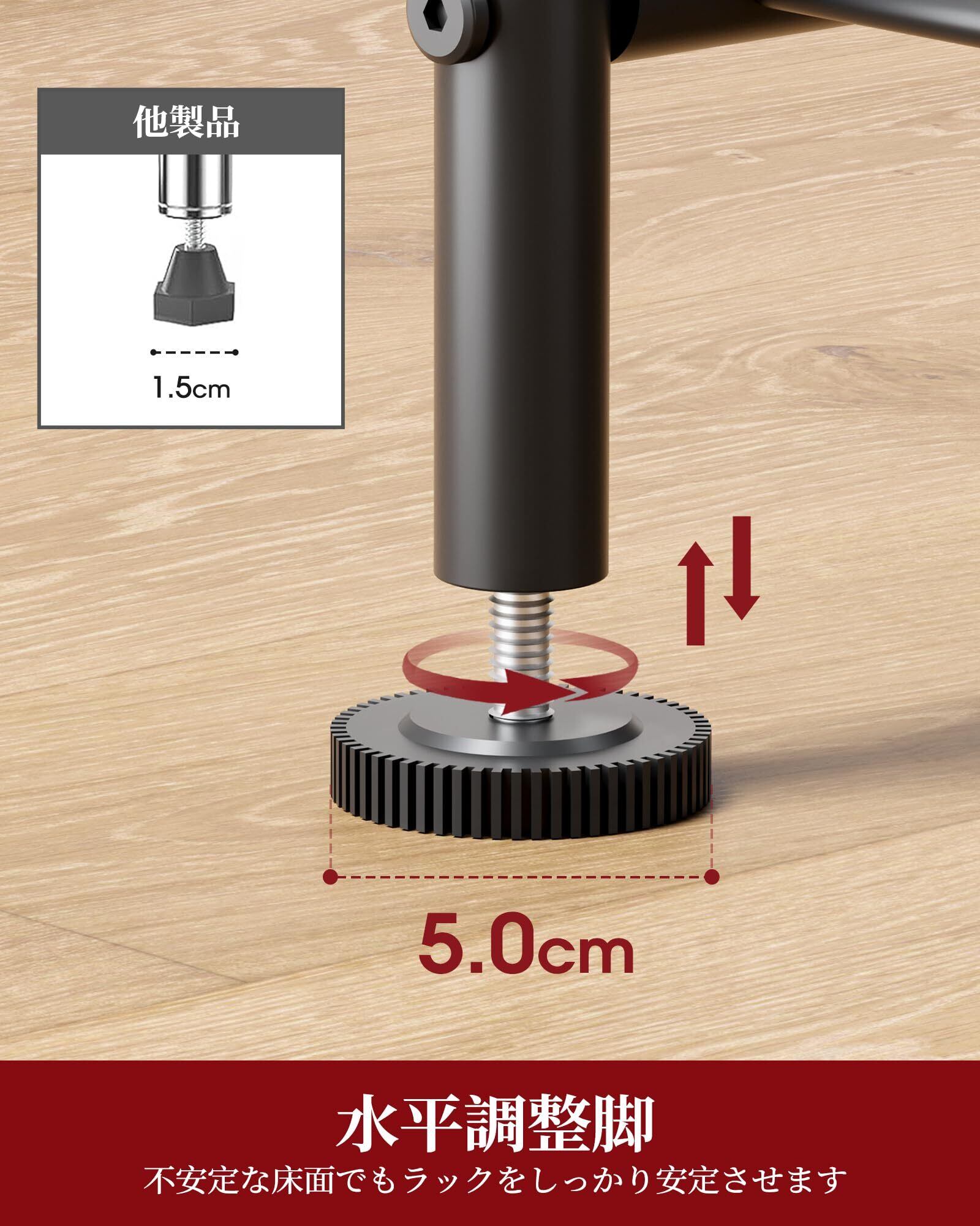 安定感抜群:棚 ラック は強化構造を採用し、各棚は 45.4kg の耐荷重を備え、重いアイテムもしっかり収納できます。さらに、4つの調整可能なアジャスター付きで、床が不安定な場合でもしっかり固定可能。各脚を調整することで、ぐらつきを防ぎ、安全で安定した設置が可能です。