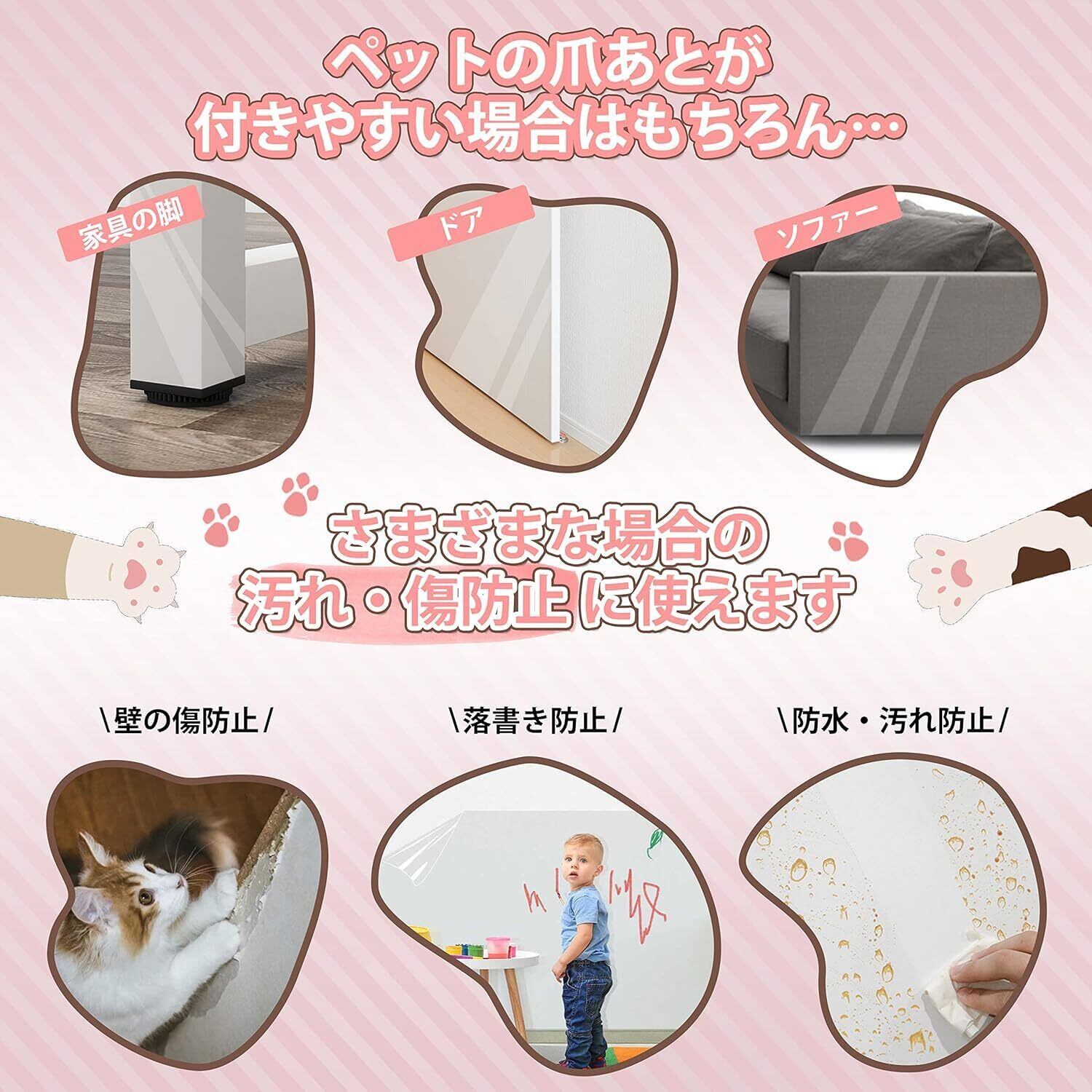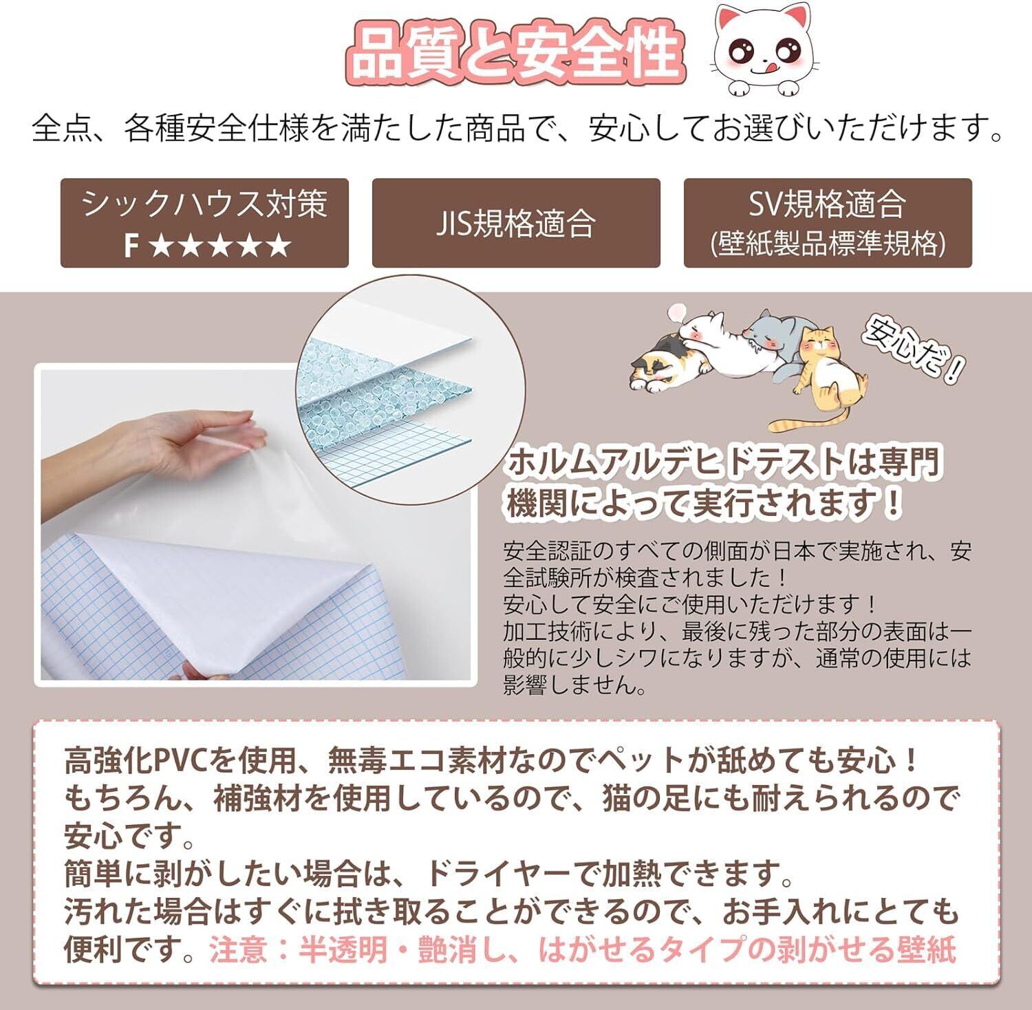 【優しい素材&目立ちにくい】:高強化PVCを使用、無毒エコ素材なのでペットが舐めても安心!分厚くて、表面防水性、耐酸性、耐油性などにも優れていて、爪とぎ・引掻き・汚れ防止にお役に立てる猫つめとぎ防止 シートです。半透明・艶消し、はがせるタイプの剥がせる壁紙。半透明の素材のため、半透明で目立ちにくく、光の反射も無いので多くの壁紙 おしゃれで違和感なくご使用いただけます。