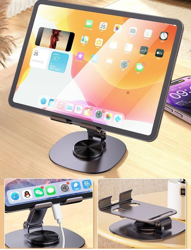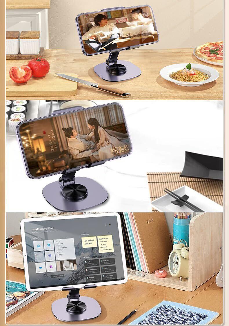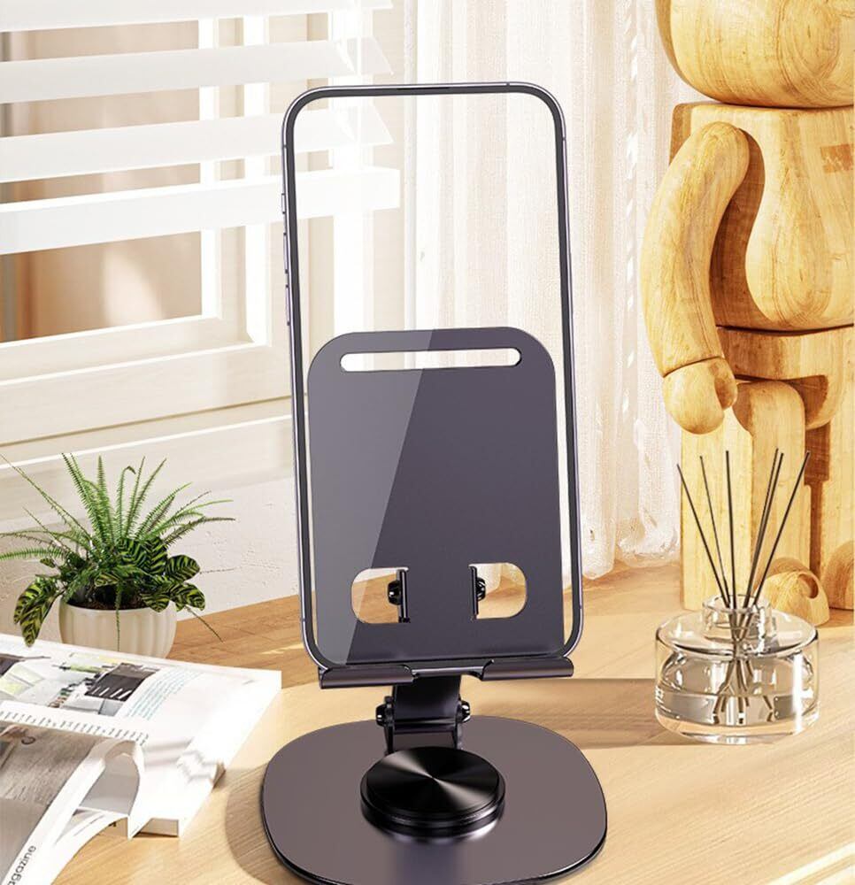 スマホスタンド台座が360度回転するため、スマートフォンやアイフォンを載せたまま、見せたい向きに自由に回転させることができます。カチカチと軽めのいい音が出ながら回転してかなり高級感があります。姿勢を改善し、首、肩、背の疲労を和らげることができます。また、角度調整可能で、使用時に自分の快適な角度や高さを自由に調整できます。