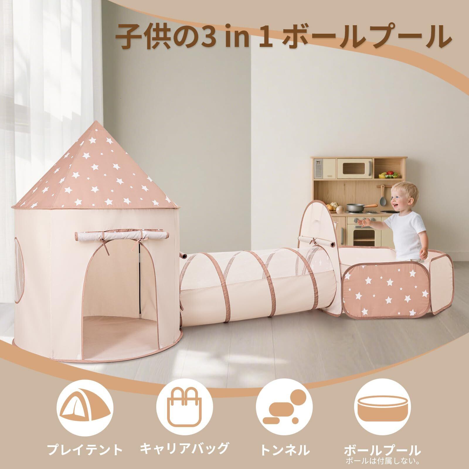 キッズテント おもちゃハウス 3 in 1ボールプール トンネル付き 子供テント アウトドア テントハウス 3点セットプレイハウス ワンタッチで簡単に組立 折り畳み式 収納バッグ付き 秘密基地 おもちゃ お誕生日/出産祝い/クリスマス プレゼント 玩具収納 室外遊具 おままごと