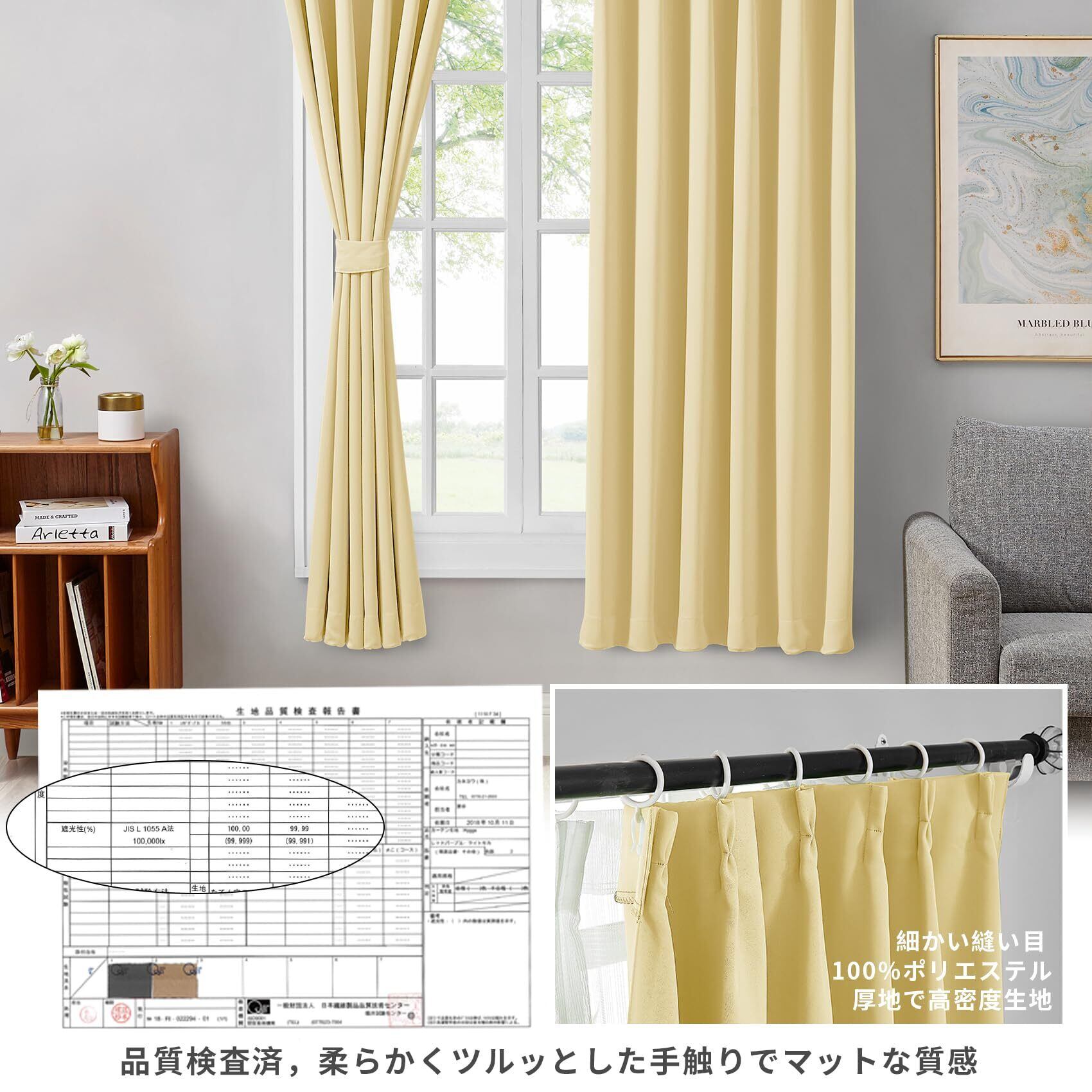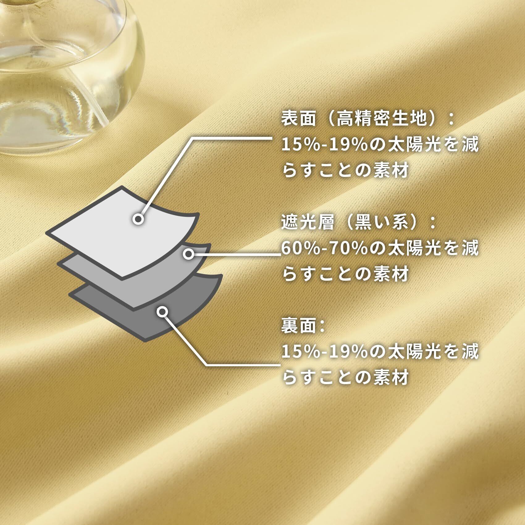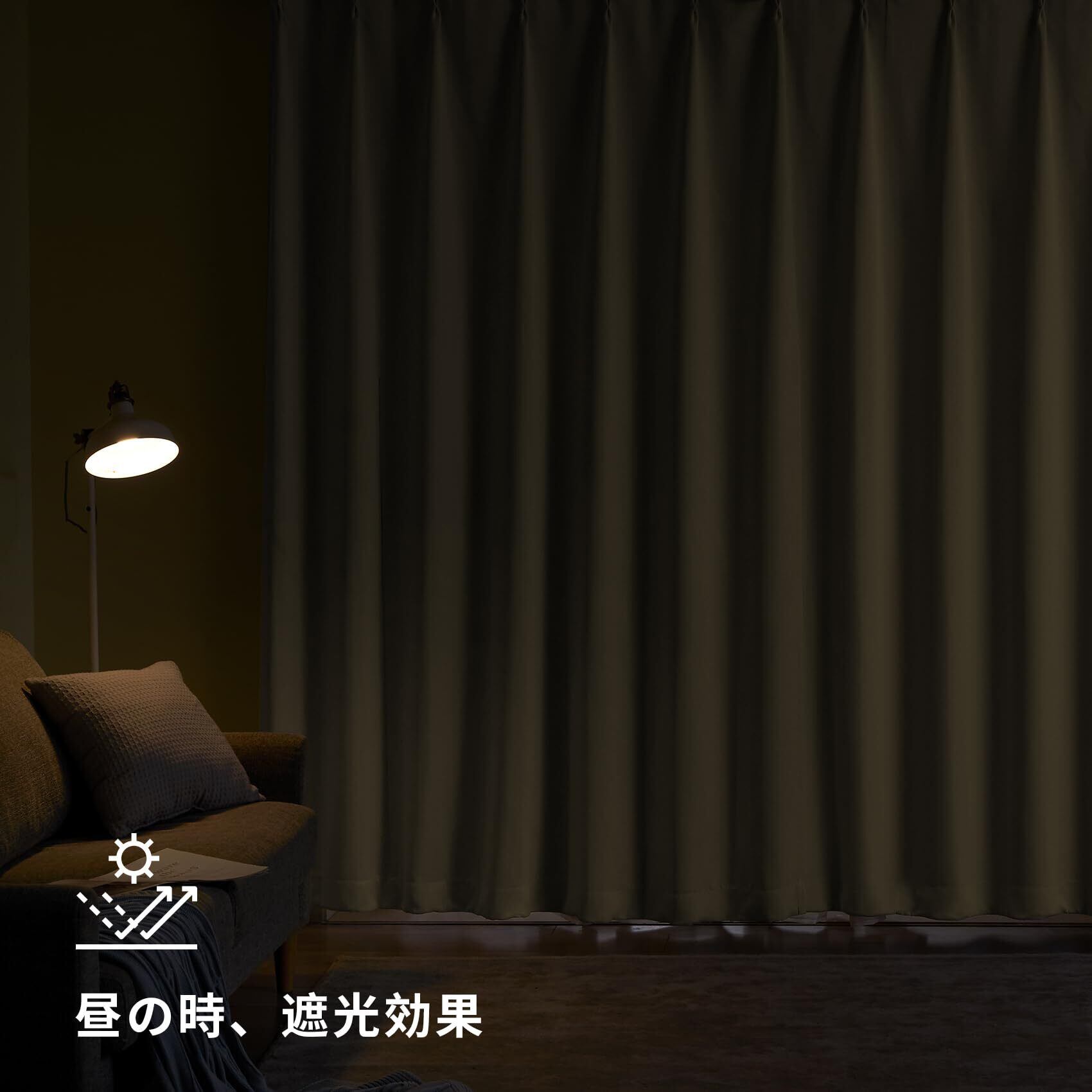 ◆【一級遮光】このカーテンは遮光度が99.99%以上,外からの光をほとんど通さないため、昼間カーテンを閉めたお部屋のなかで相手の顔の表情が分からない程度にまでお部屋を暗くできます。同じ等級であっても、カーテンの明度や色彩によって遮光の度合いが変わります。薄い淡い色は光を通しやすく、濃い暗い色は光を通しにくいです。遮光性を重視される方は濃色をおすすめします。