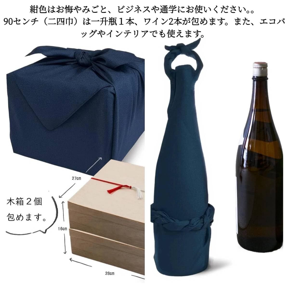3サイズで便利に使い分け Lサイズ:70cm(小物・瓶1本)、大判:90cm(ワイン2本・日常用)、特大サイズ:140cm(大物・バッグ代用)と用途に合わせたサイズを選べるふろしきです。