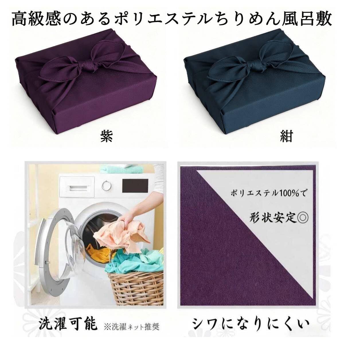 高級ポリエステルちりめん風呂敷 シワになりにくく、光沢感のあるちりめん風合いで、贈り物や日常使いに品格とエレガンスをプラスします。