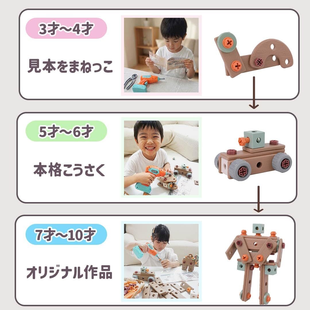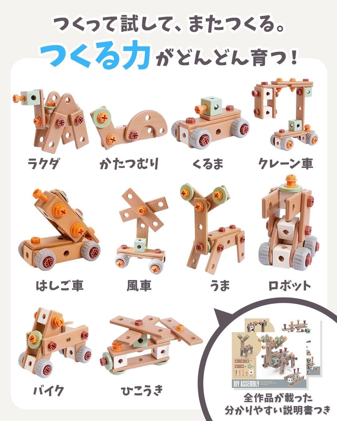【100通り以上の組み立てパターン】遊びの幅が無限大! 車、飛行機、動物、ロボットなど、多彩な作品を作れるパーツ構成で、何度でも飽きずに楽しめます。 【やさしい説明書付き】はじめてでも安心して遊べる。 親子で見ながら作れるイラスト解説つき。3歳のお子様でも真似して楽しくDIY遊びがスタートできます。