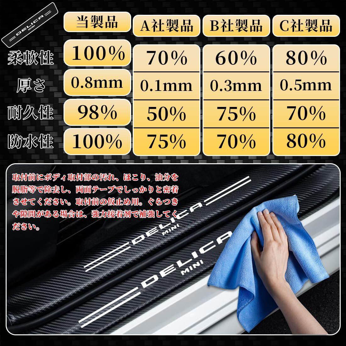 【上質な材質】弊社の製品は上質な炭素繊維材質を使い.炭素繊維材質によって形成された製品は、耐久性が強い同時に柔軟性も素敵、折れても元の状態になることができ、段差にあってもしっかりと貼り付け、ご愛車を傷とスクラッチから守ります.
