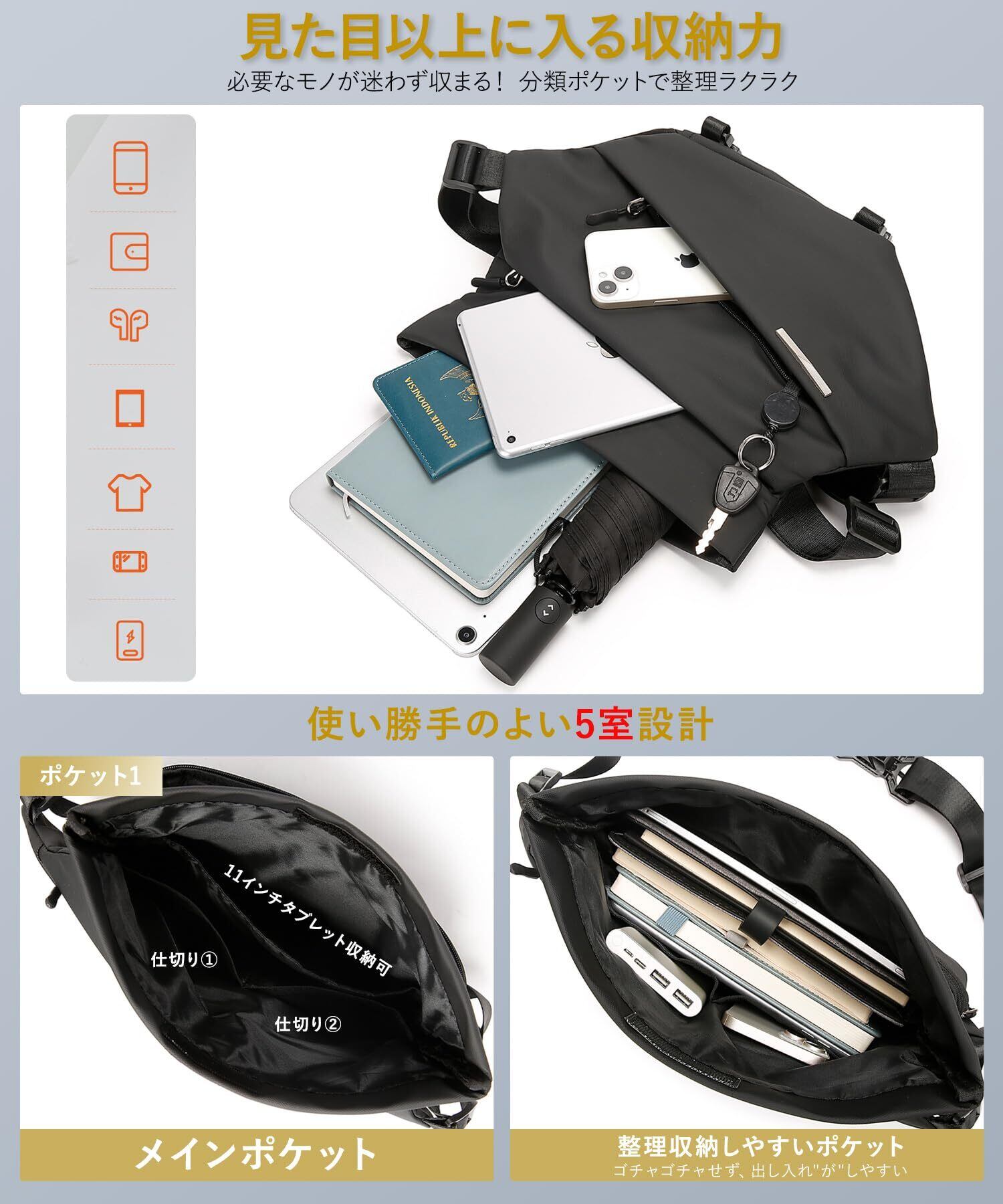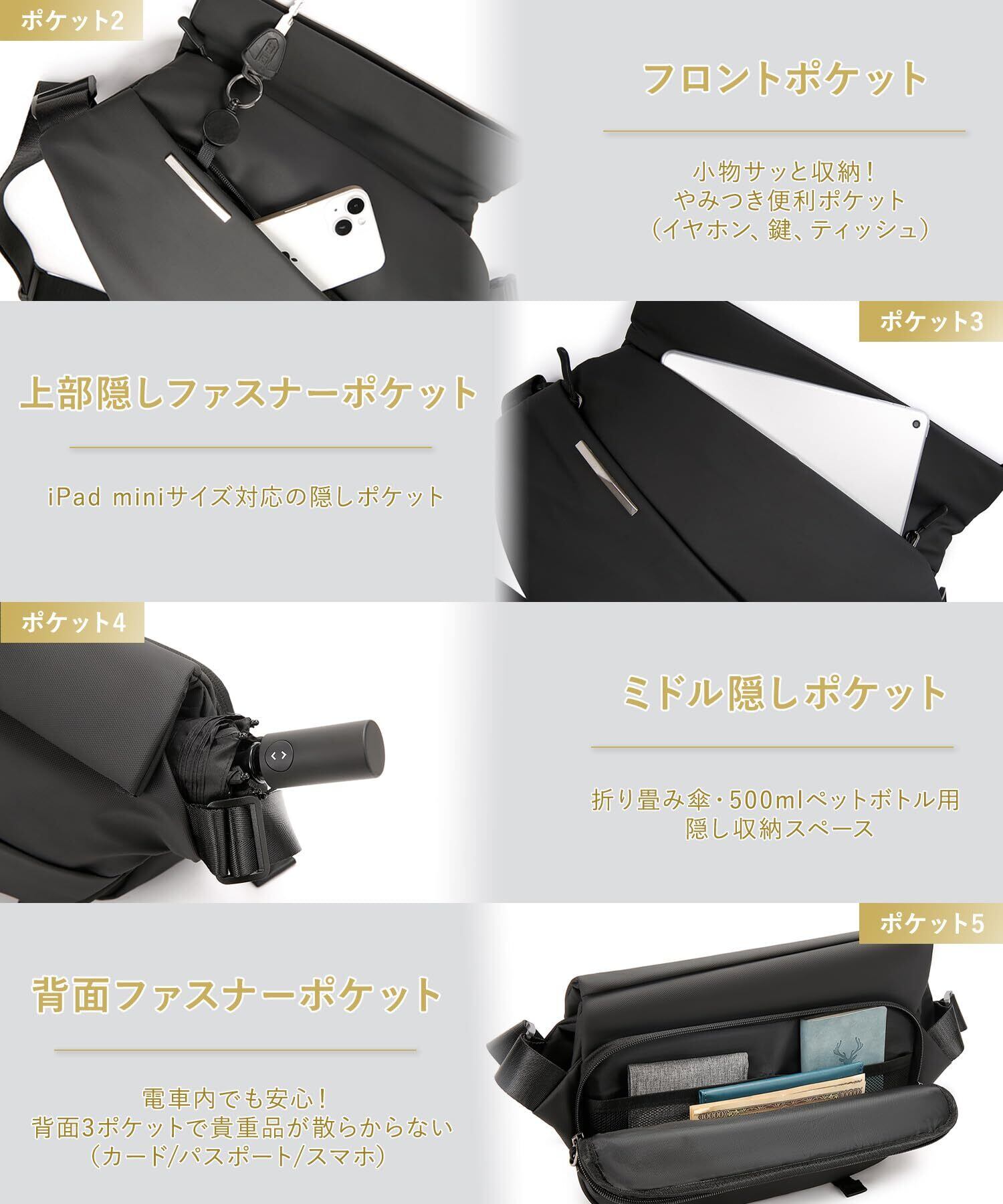 【多層収納】:3つのジッパーポケット+1つの隠しポケット+ 1つのメインポケット。フロントポケットからワイヤレスイヤホン、ポケットティッシュ、キーなど小物をにすばやくアクセスできます。中間にあるジッパーポケットには、職員証、交通系ICカード、ノートなど、使用頻度の高い小物を収納できます。隠しタイプバックポケットにはスマホとクレジットカードなどの貴重品を収納できます。メインポケットに複数の内部ポケットがあり、iPad、長財布、手帳、折畳傘、充電器などの持ち物を収納できます。隠し機能ポケット:短い傘やペットボトルを収納できます。