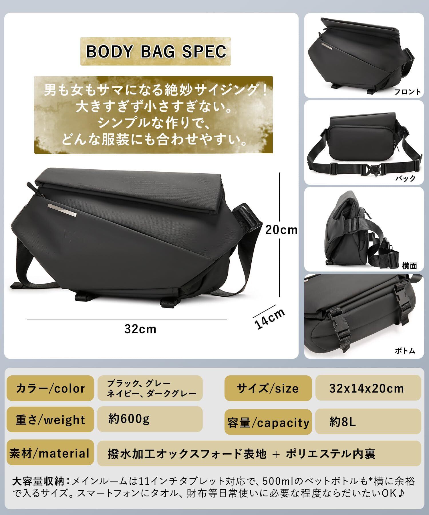 【適用シーン】軽量、撥水、大容量て持ちやすいワンショルダです(サイズ:32×14×20cm)。複数の持ち運び方法:ボディバッグ、クロスボディバッグ、斜め掛けバッグ、ショルダーバッグ、ワンショルダーバッグ。シンプルで合わせやすいブラック・グレー・ダークグレー・ネイビーの4カラー展開デザインな、夏場でも冬場でも色んな服装に合わせやすいし。ショッピング、ライブ、アウトドア、ウォーキング、サイクリング、ちょっとしたお出かけにも最適な万能ボディバッグです。