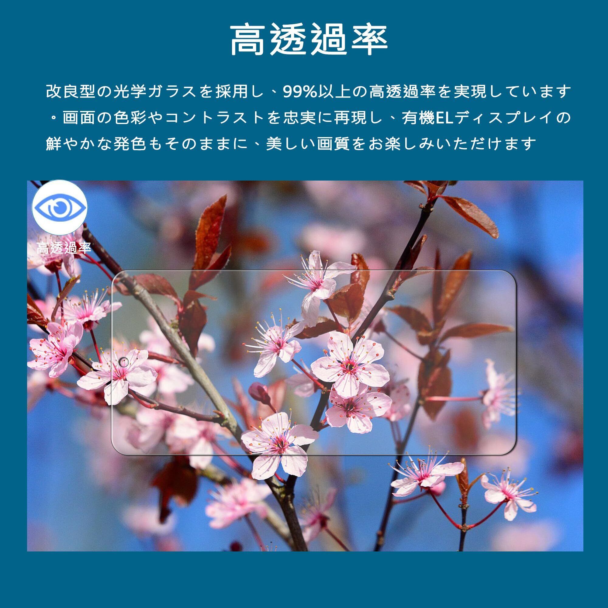 【高透過率】:改良型の光学ガラスを採用し、99%以上の高透過率を実現しています。画面の色彩やコントラストを忠実に再現し、有機ELディスプレイの鮮やかな発色もそのままに、美しい画質をお楽しみいただけます。裸眼と変わらない高い視認性を確保し、ゲームや動画視聴でも没入感のある体験が可能です
