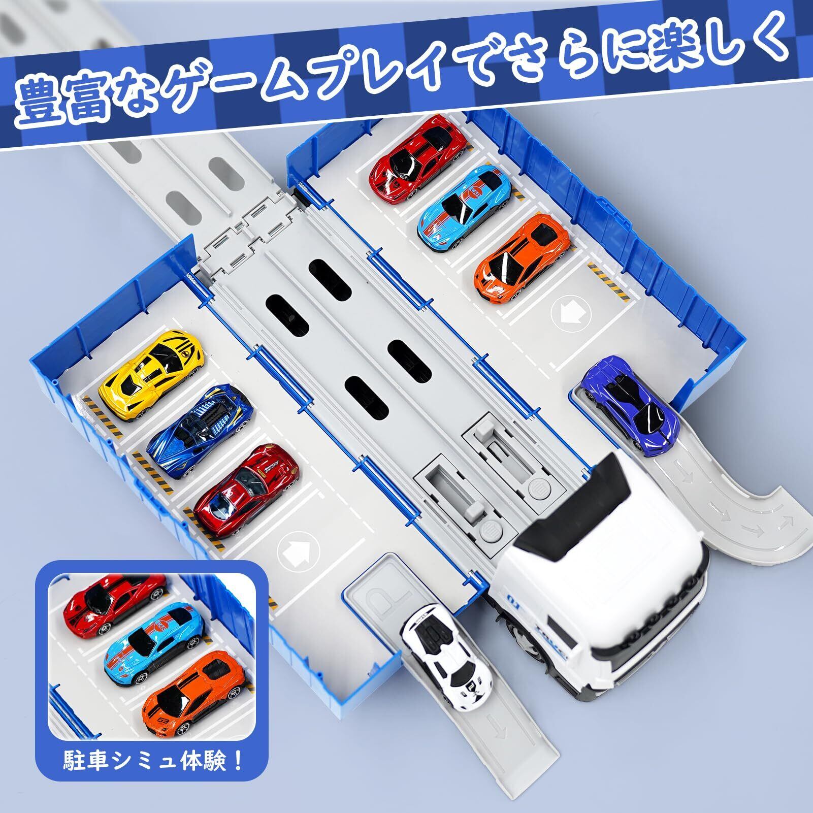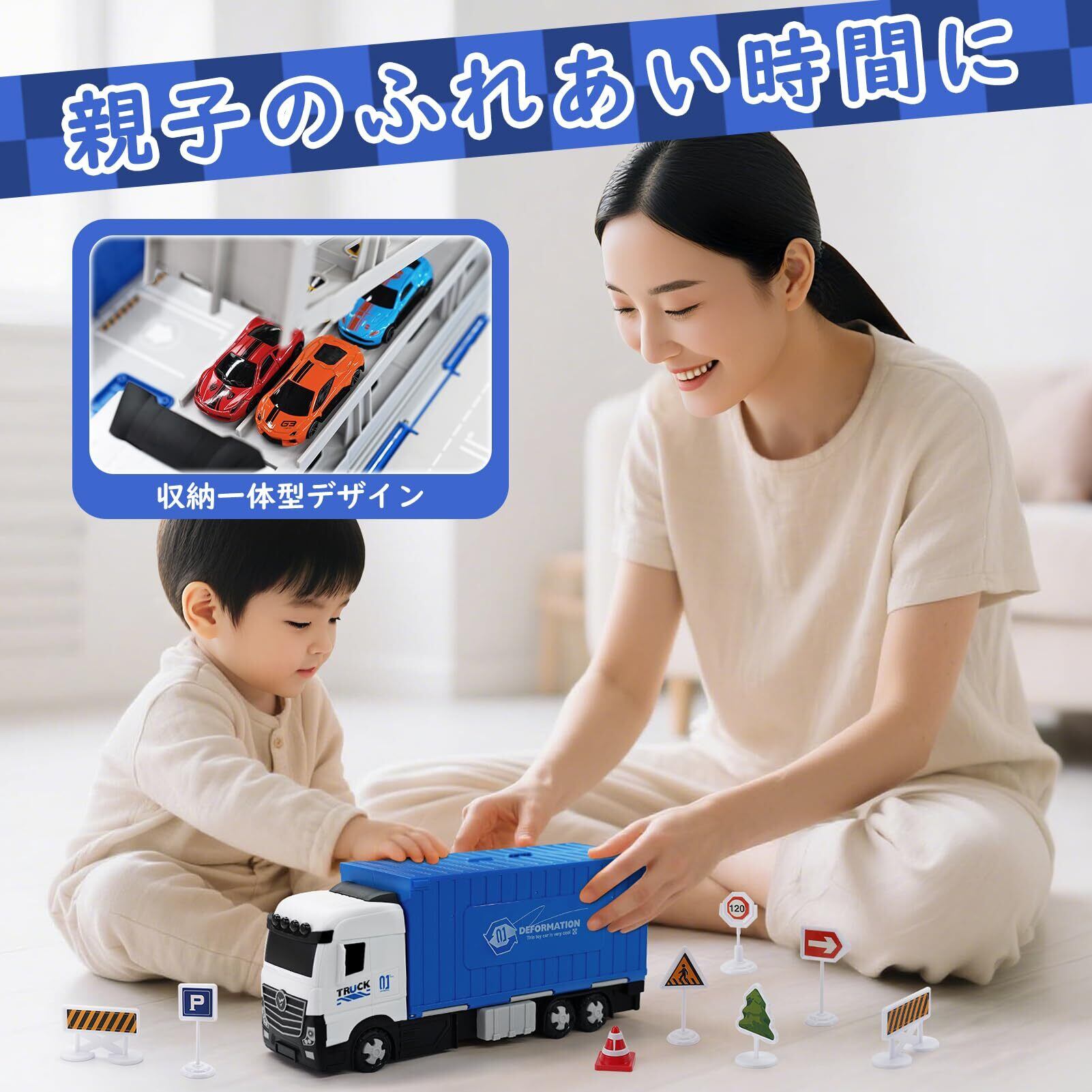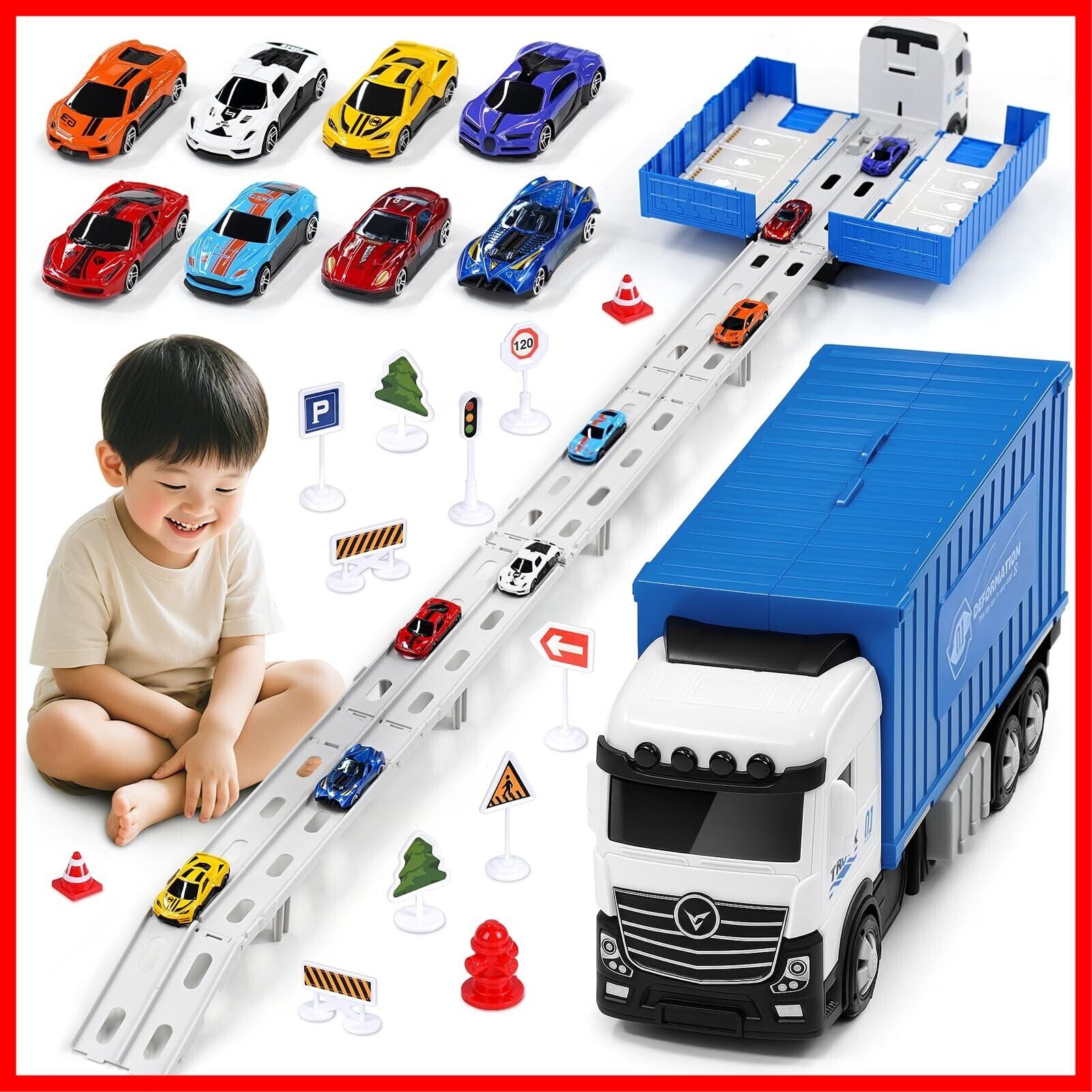 【カートイセット】- 大型トラック1台、合金製メタルカー8台、道路標識アクセサリー12個が含まれています。トラックにはABSプラスチック製の6つの丈夫な車輪が付いており、落下にも強い設計です