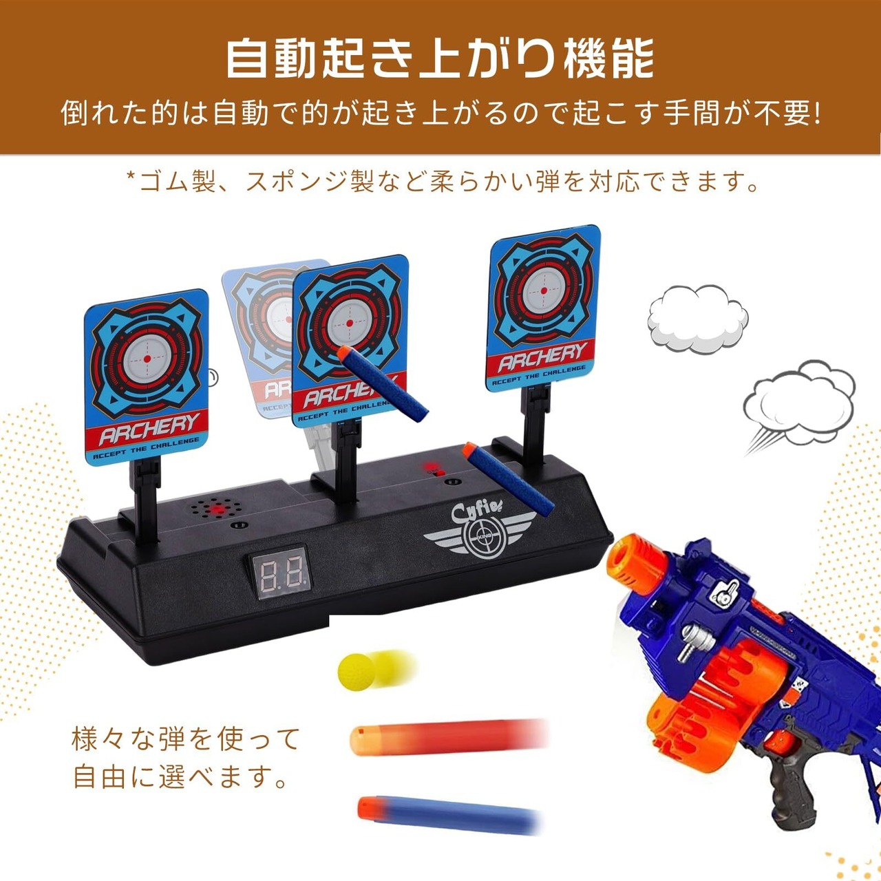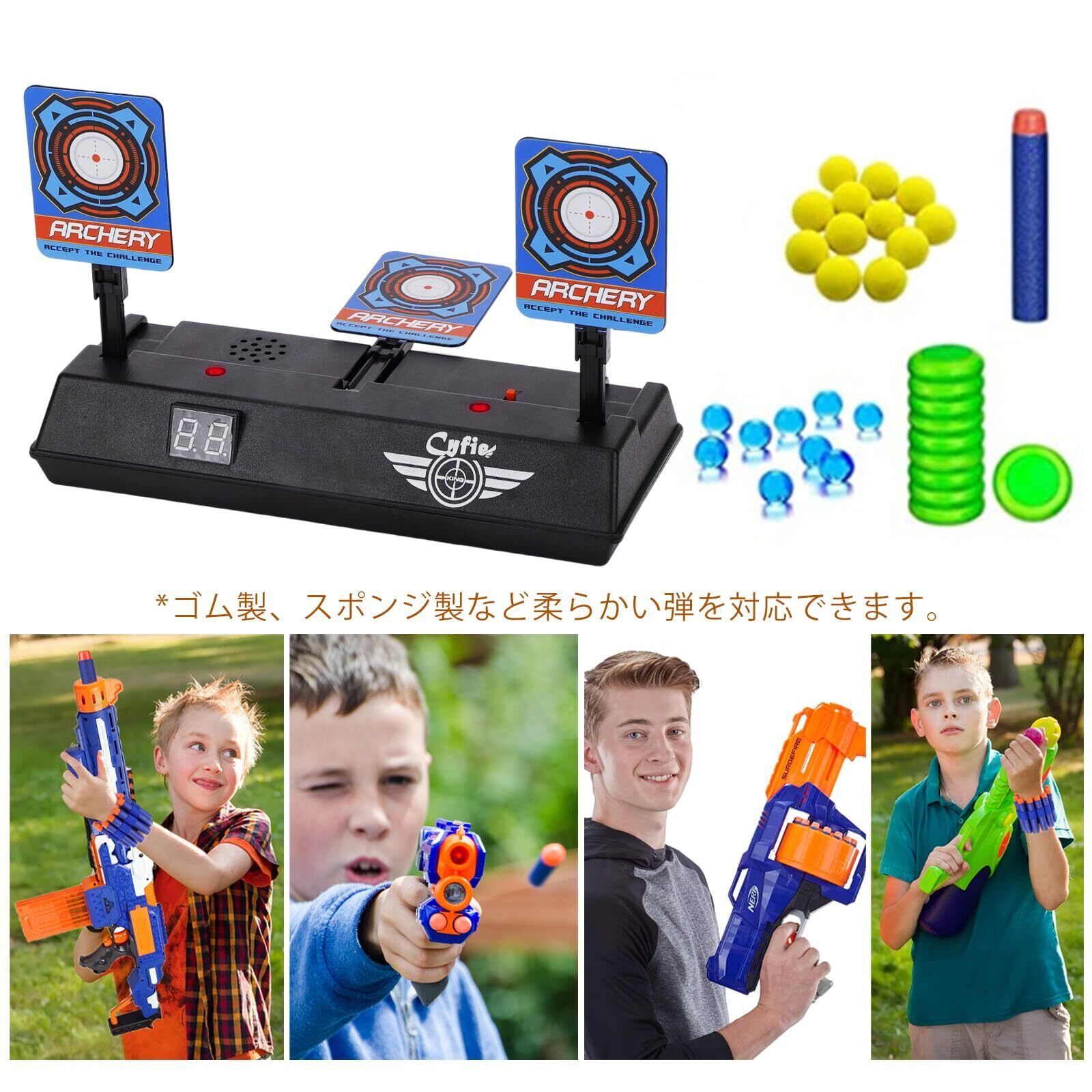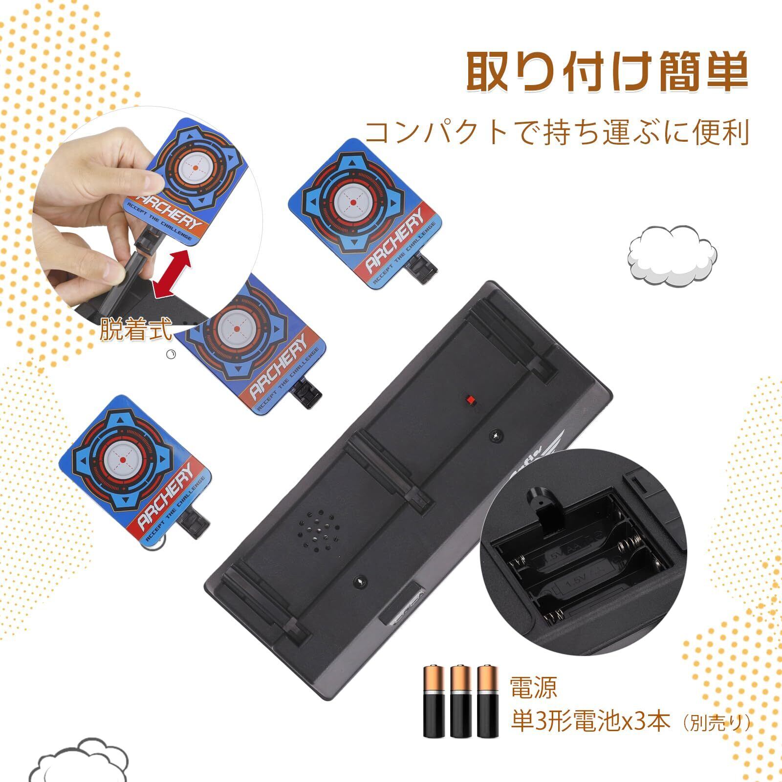 「仕様変更により、実際の商品においては画像とロゴが異なる場合がございますが、品質上、使用上の問題はありません」【仕様】電子ターゲットx1、取替える的x6 取替える標的6個付き、壊れる心配がいりません。(*ゴム製、スポンジ製など柔らかい弾を対応できます)
