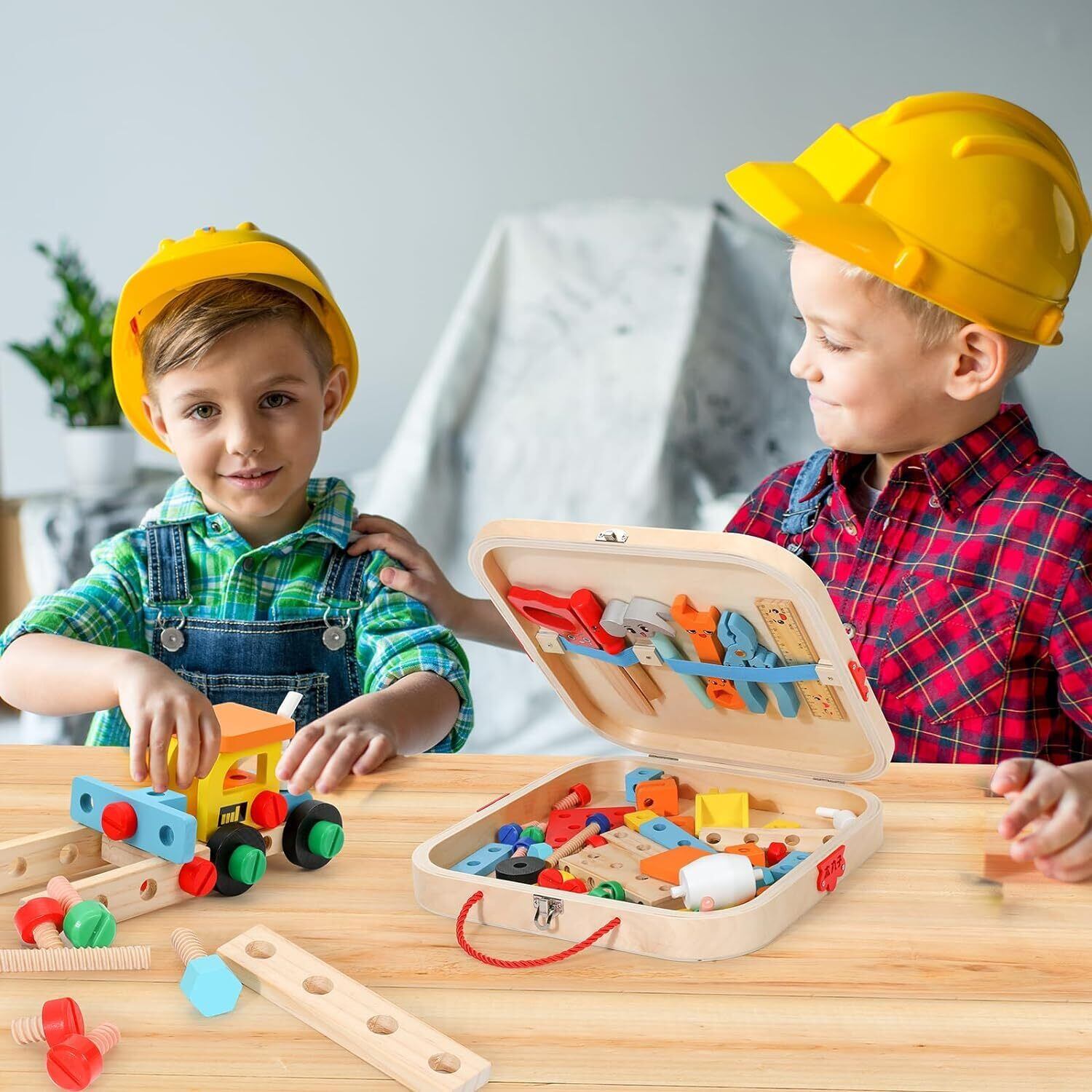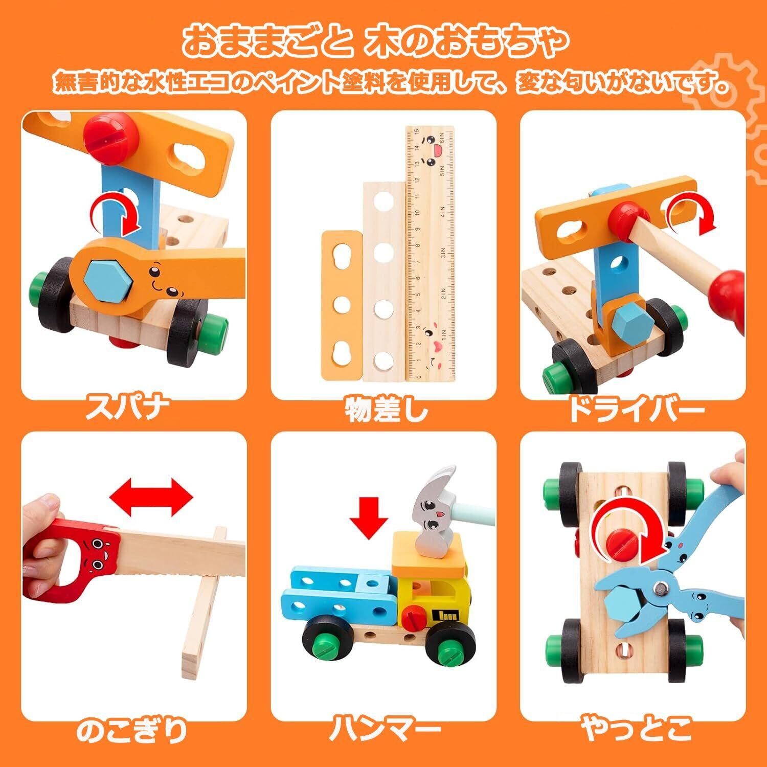 安全丈夫な材質:この木製大工さんセットは天然木を採用し、使用される木材は厳選されています。無害的な水性エコのペイント塗料を使用して、変な匂いがないです。ネジ関連の部材には高品質PPプラスチックがら作られます。高強度、環境にやさしく無毒無臭、丈夫で耐久性です。