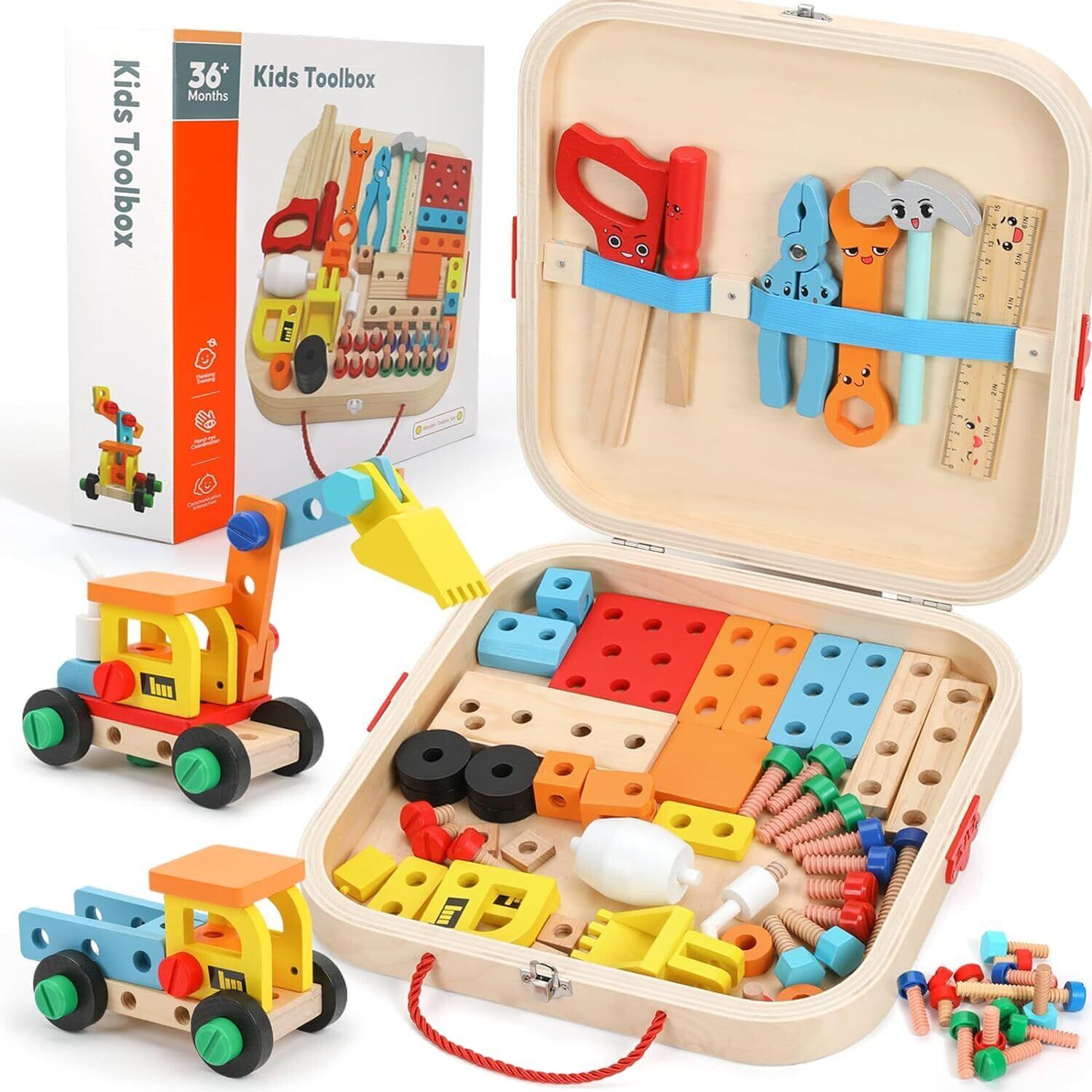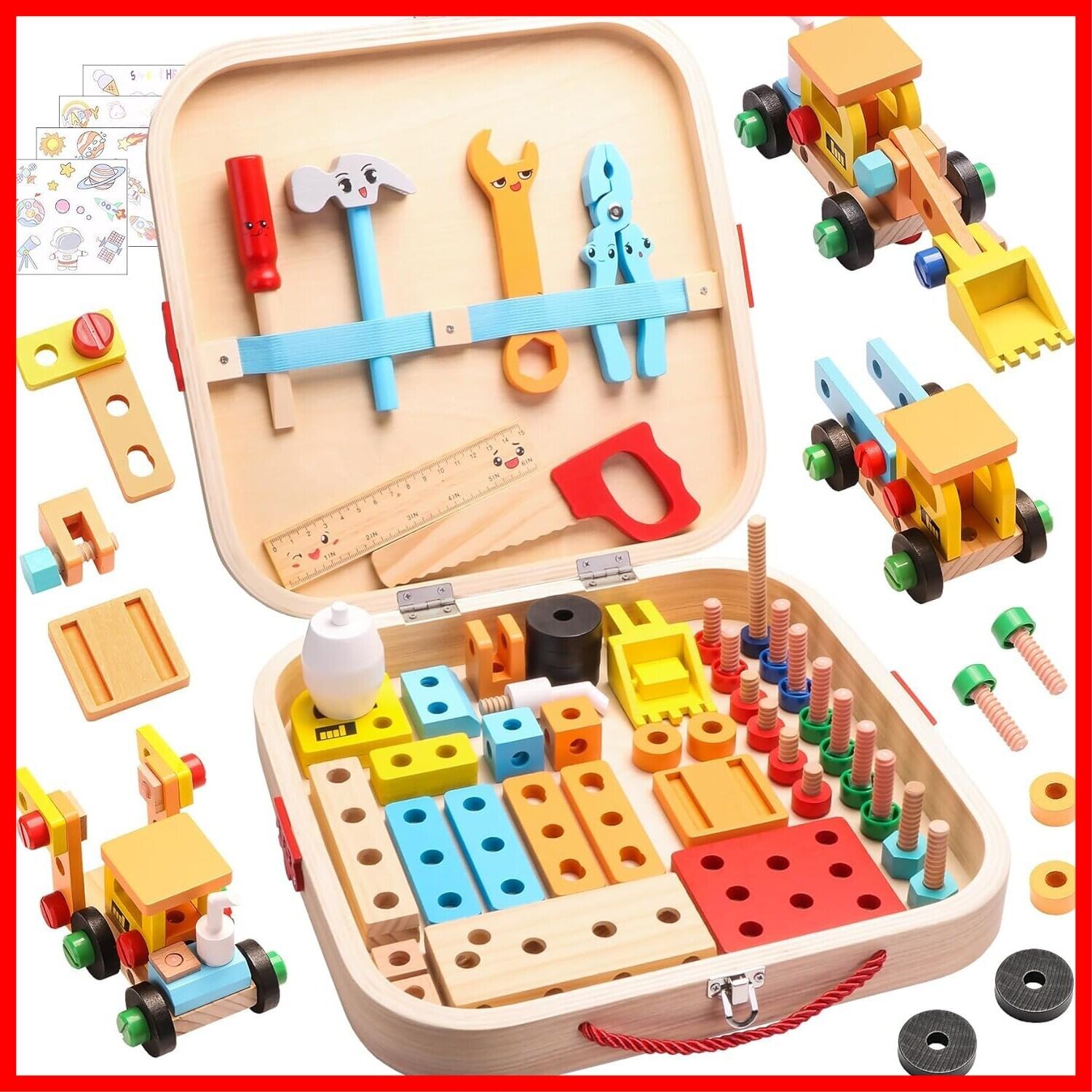 Popgaga 大工さんセット 組み立て 男の子 女の子 木製おもちゃ 知育玩具 モンテッソーリ 木のおもちゃ 工具 ままごと ごっこ遊び 大工さんごっこ プレゼント 子供人気 誕生日 クリスマス 収納ボックス付き