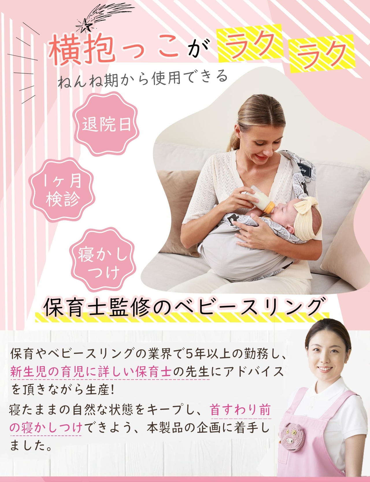 【手軽に使えるだっこひも】さっと着脱ができます。密着できるからまるでママのお腹の中にいるみたい。赤ちゃんへより安定感を与えられます。おでかけや乳児検診、寝かしつけに最適です。