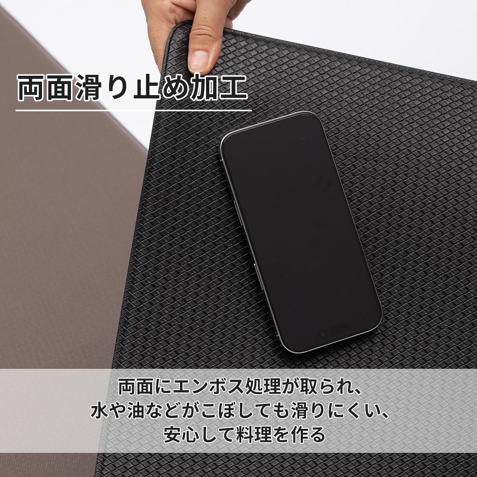 【ズレにくい設計】表面にはエンボス加工により、肌に触れてもベタつかないので、裸足で過ごす派の方も快適にお使いいただけます。裏面は繊細な凹凸加工が施されており、マットのズレを軽減します。行き来の多いキッチンでの移動や、掃除機がけの際もズレにくく快適にお使いいただけます。