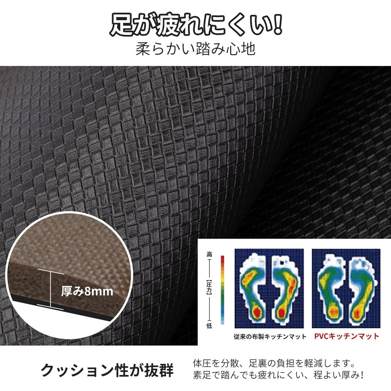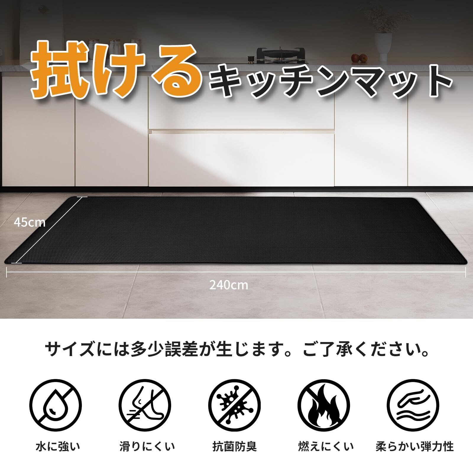 【製品仕様】サイズ:約45*240CM 厚さ:約8mm 素材:ポリ塩化ビニール クッション性が抜群です。踏み心地がよく、足裏にかかる体重を分散し、料理を作る時、足腰の疲労を和らげることができ、長時間の家事をしても快適です。お皿など落としても衝撃を緩和することができます。