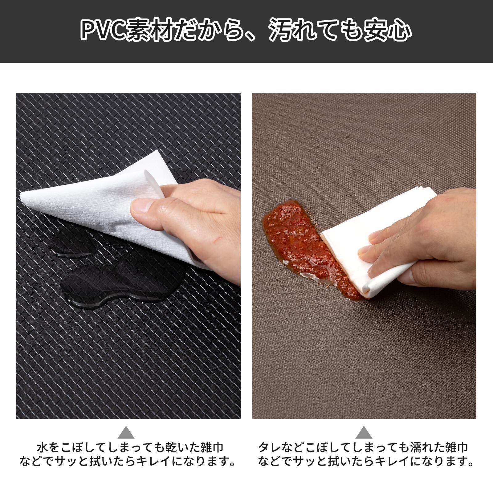 【洗濯しなくてもいい】掃除には手間がかからないポリ塩化ビニール素材で、汚れてもサッと拭けます。シンクの前に敷いて、料理中にうっかりこぼしてしまった調味料や水、コンロ使用中での油汚れなど、キッチン周りで発生する様々な汚れもPVC素材なら染み込まないので、お手入れ簡単な商品です。