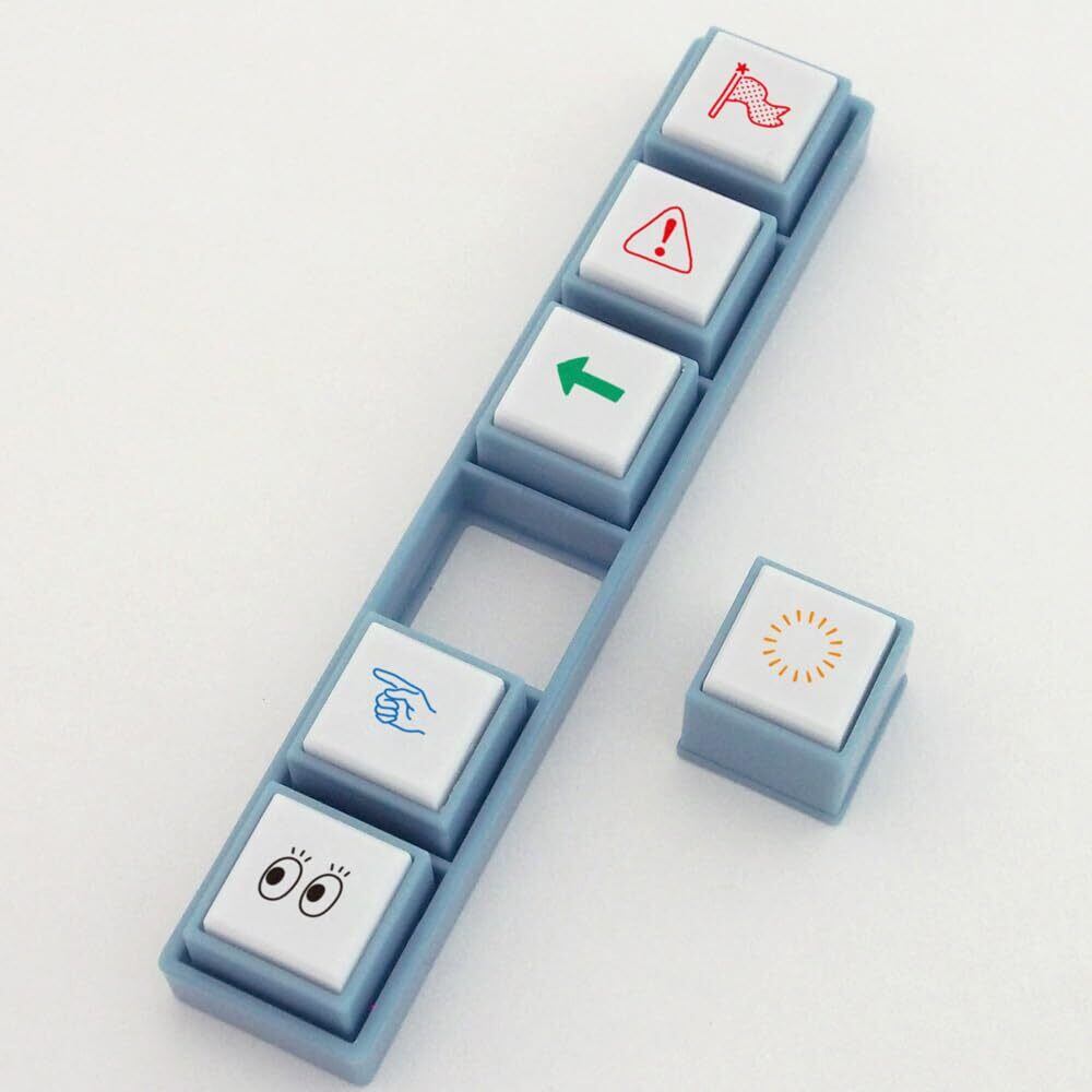 6個のボタン型スタンプが枠にカチッとはめてあり、スタンプがはずれてバラバラにならないように、透明のケースに入っています。