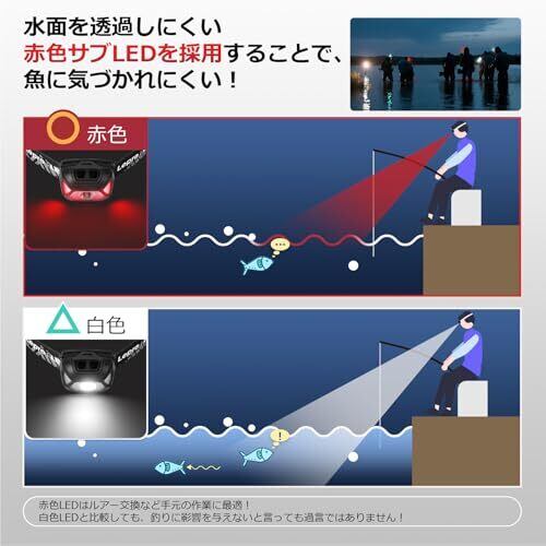 【スポット・ワイド・赤色サブLED切替】スポットモード:High/4時間点灯、Low/12時間点灯。ワイドモード:High/10時間点灯、Low/15時間点灯。赤色LEDモード:赤色点灯とSOS赤緑点滅/15時間点灯。※赤色LEDライトは魚を警戒させず夜釣りに最適です。雨や霧などの悪天候時も視認性が高く、遠方からの確認が容易なため、事故防止に役立ちます。