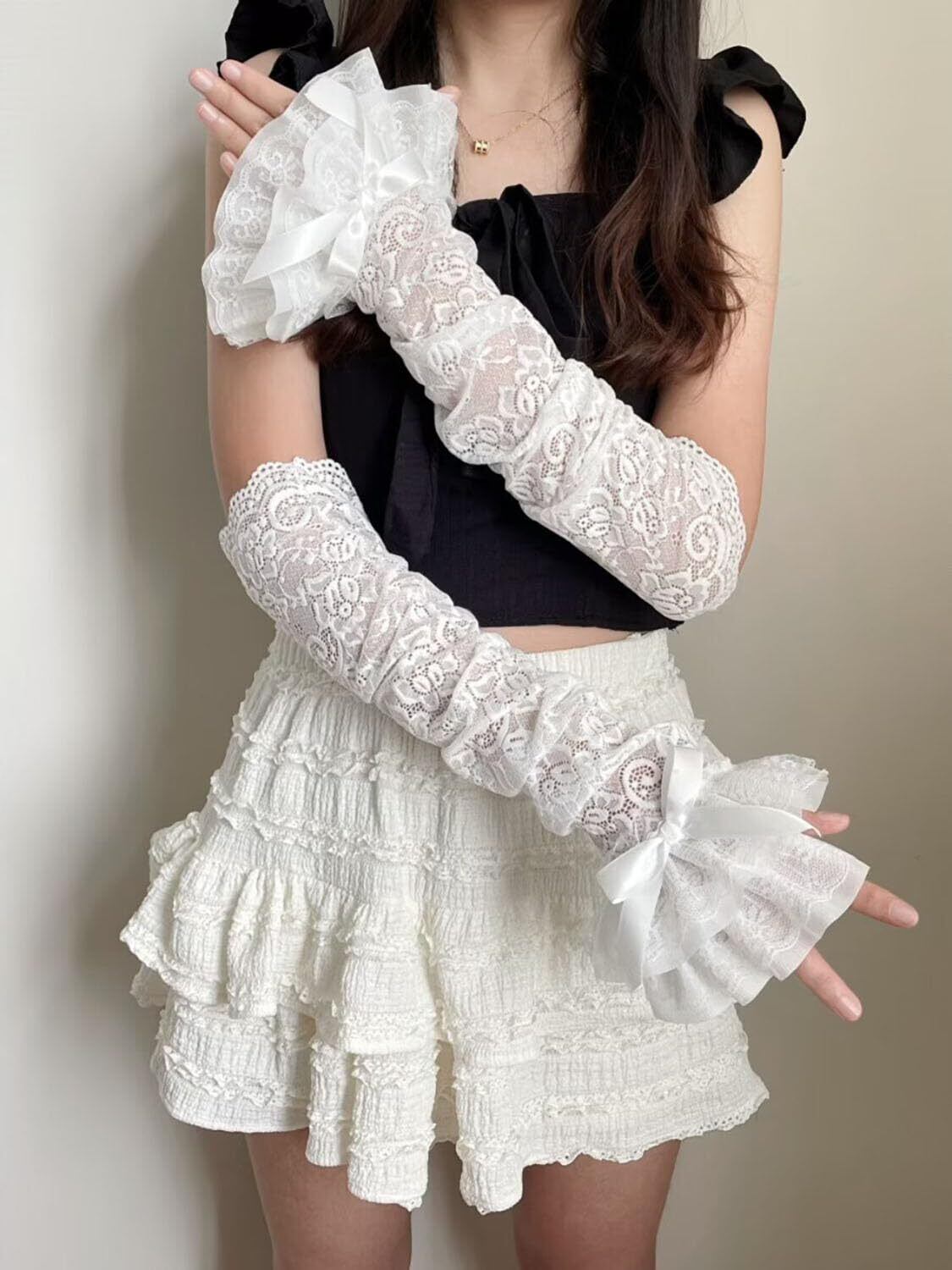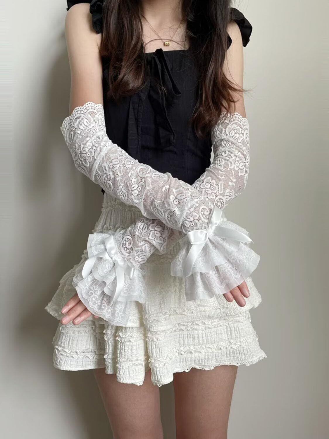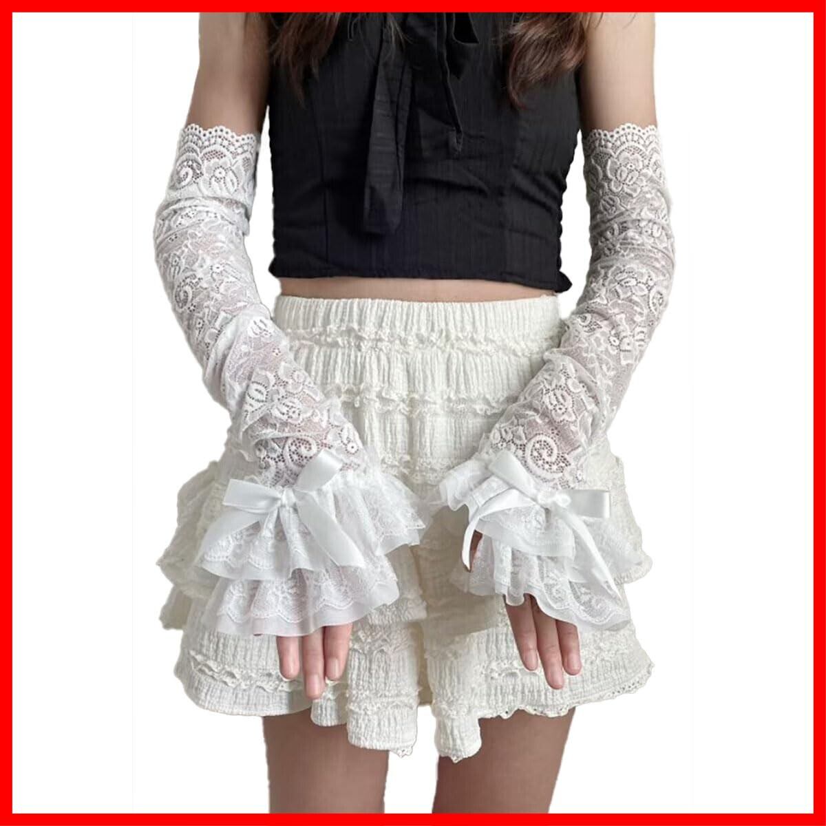 アームウォーマー レディース つけ袖 レースフリル アームスリーブ 薄手 花柄 指掛けタイプ かわいい ロリータ 袖口積み重ね ちょう結び おしゃれ y2k 日焼け止め ガーリー系 お姫様 地雷系 ホワイト