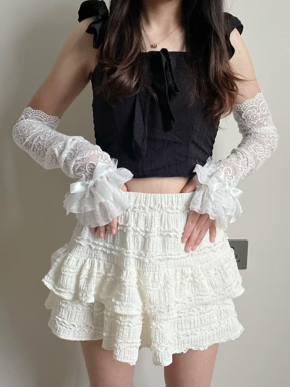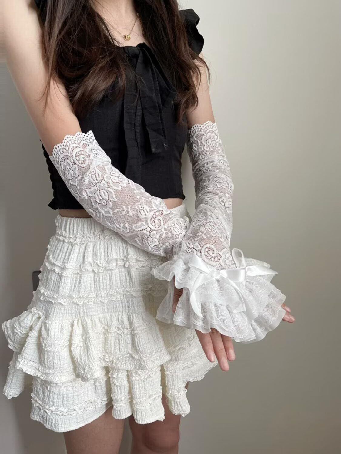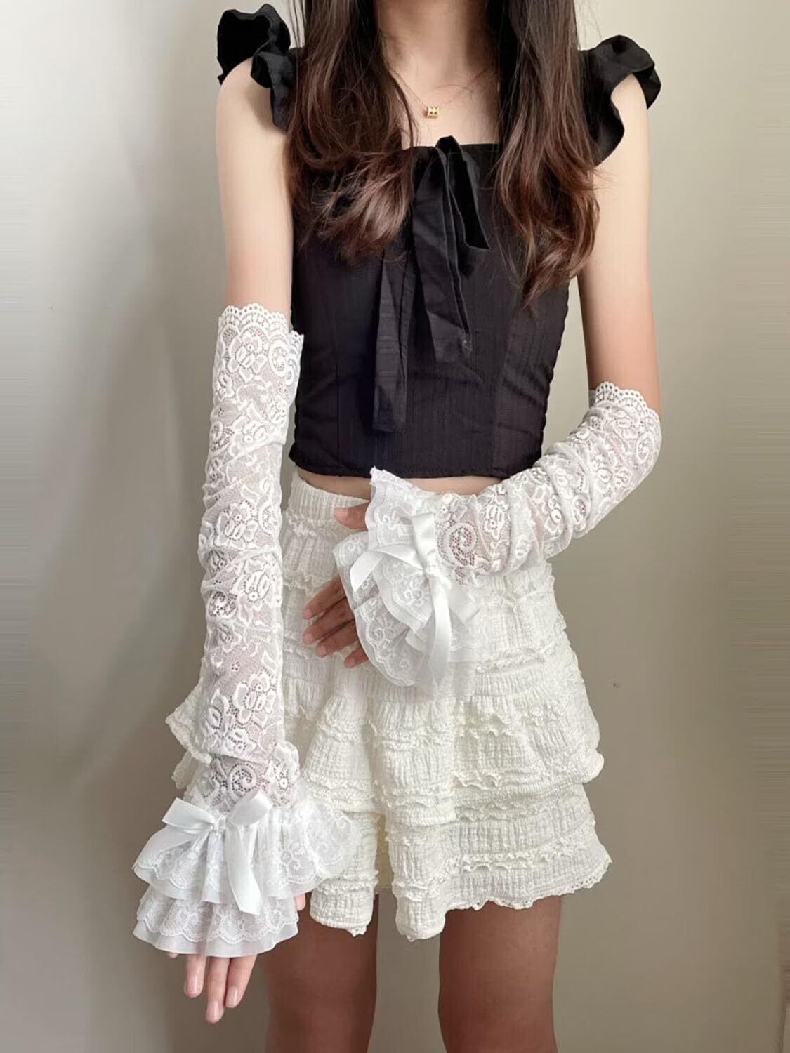 アームウォーマー レディース つけ袖 レースフリル アームスリーブ 薄手 花柄 指掛けタイプ かわいい ロリータ 袖口積み重ね ちょう結び おしゃれ y2k 日焼け止め ガーリー系 お姫様 地雷系 ホワイト