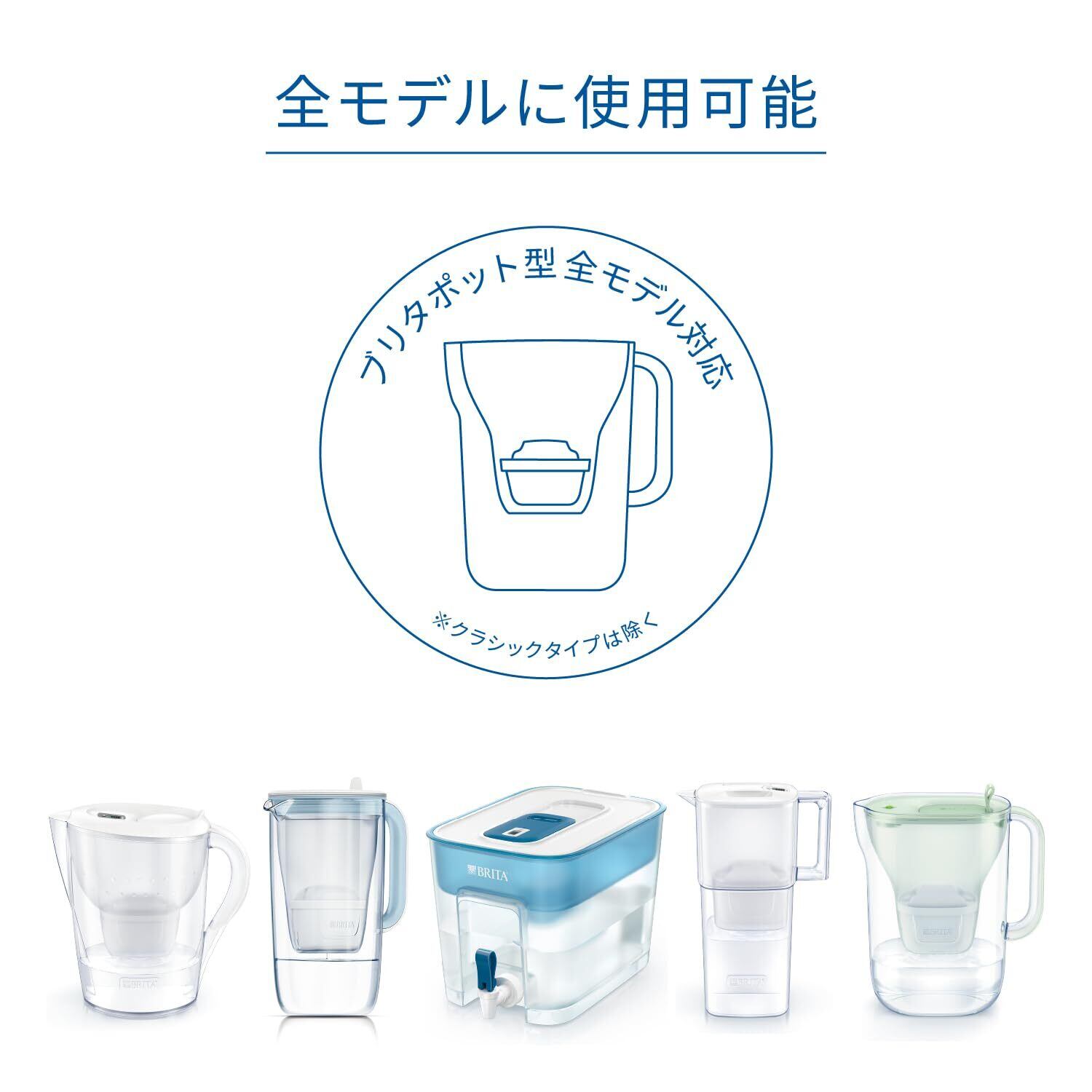 ブリタ(BRITA)のポット型(ピッチャー型)、タンク型浄水器の全モデルにご使用いただけます(クラシックを除く)