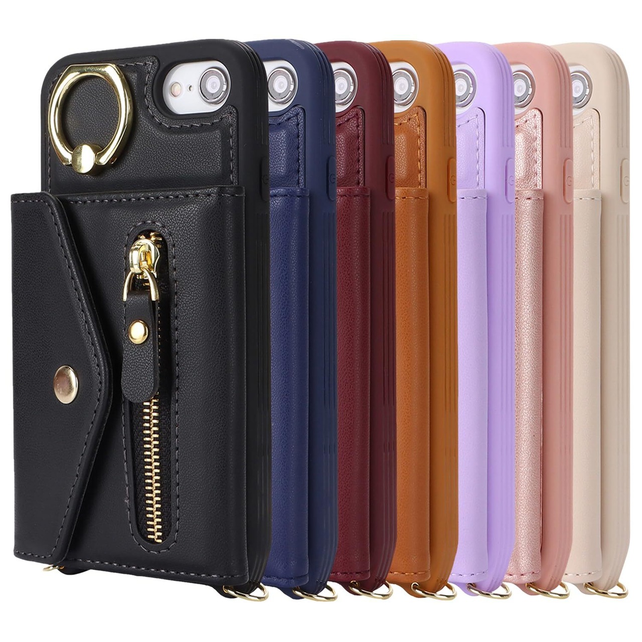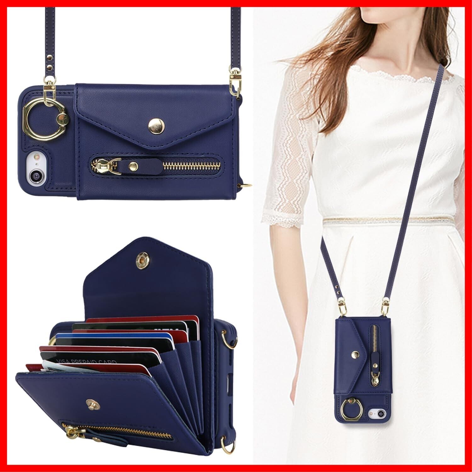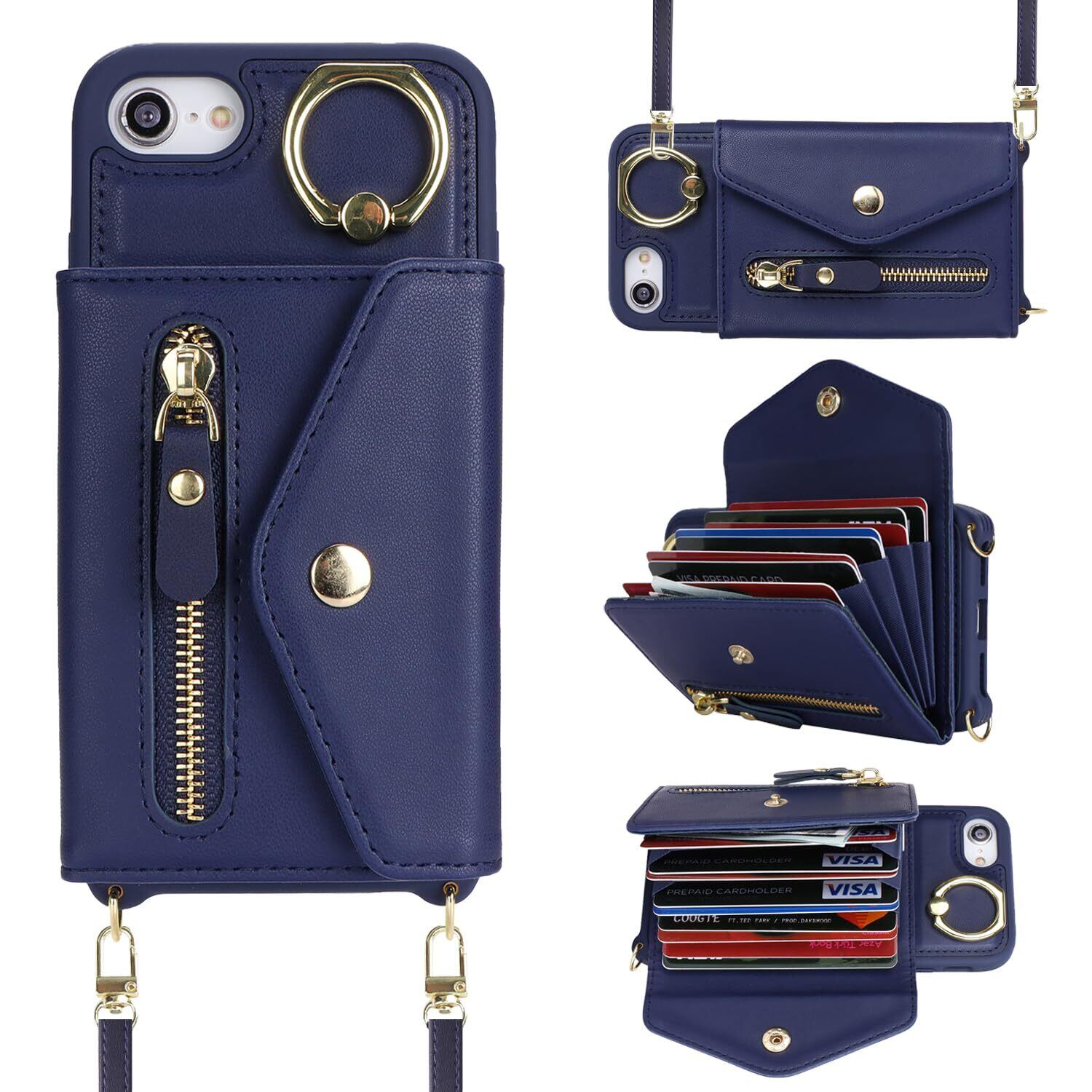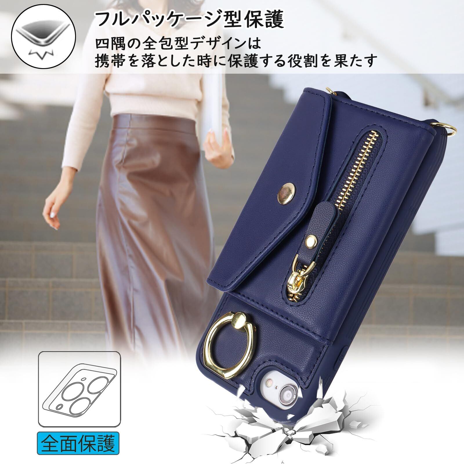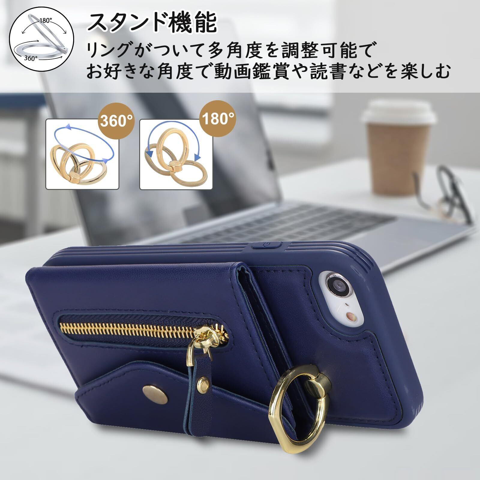 対応 iPhone se ケース オシャレ ショルダー iphonese第3世代 ケース カード収納 大容量 iphone8 ケース 手帳型 リング付き スマホカバー 耐衝撃 全面保護 スタンド機能 iphone7ケース 肩掛け 斜めかけ カバー -ブルー