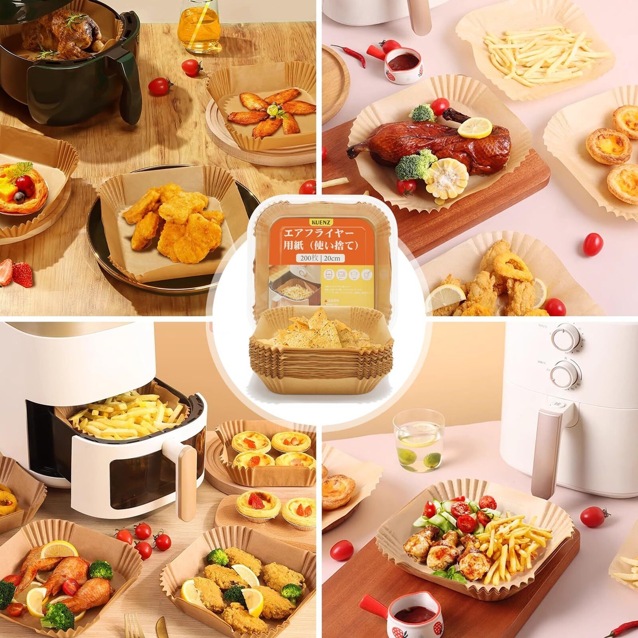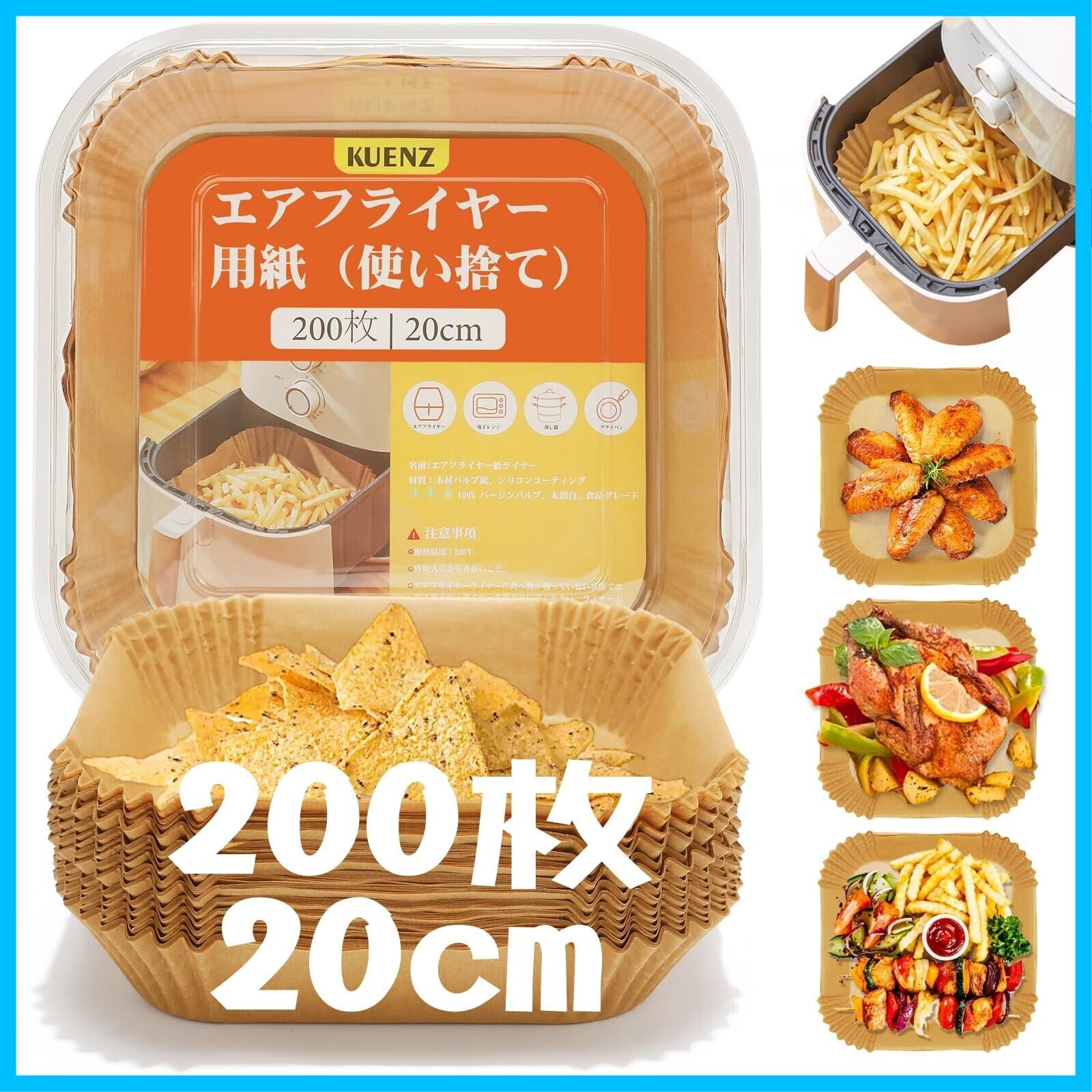 KUENZ エアフライヤー用紙 200枚セット20cm 四角形 ノンフライヤー 使い捨て紙 天ぷら敷紙 油紙 クッキングシート シリコーンオイル紙 耐熱/耐油/耐水性 对应 烹饪垫 電子レンジ 5-8L適用 電子レンジ/オーブン/蒸し器 対応エアフライヤー 230℃耐熱